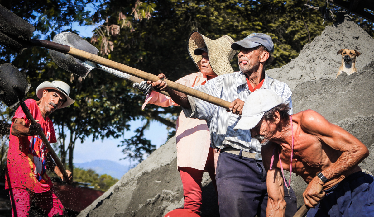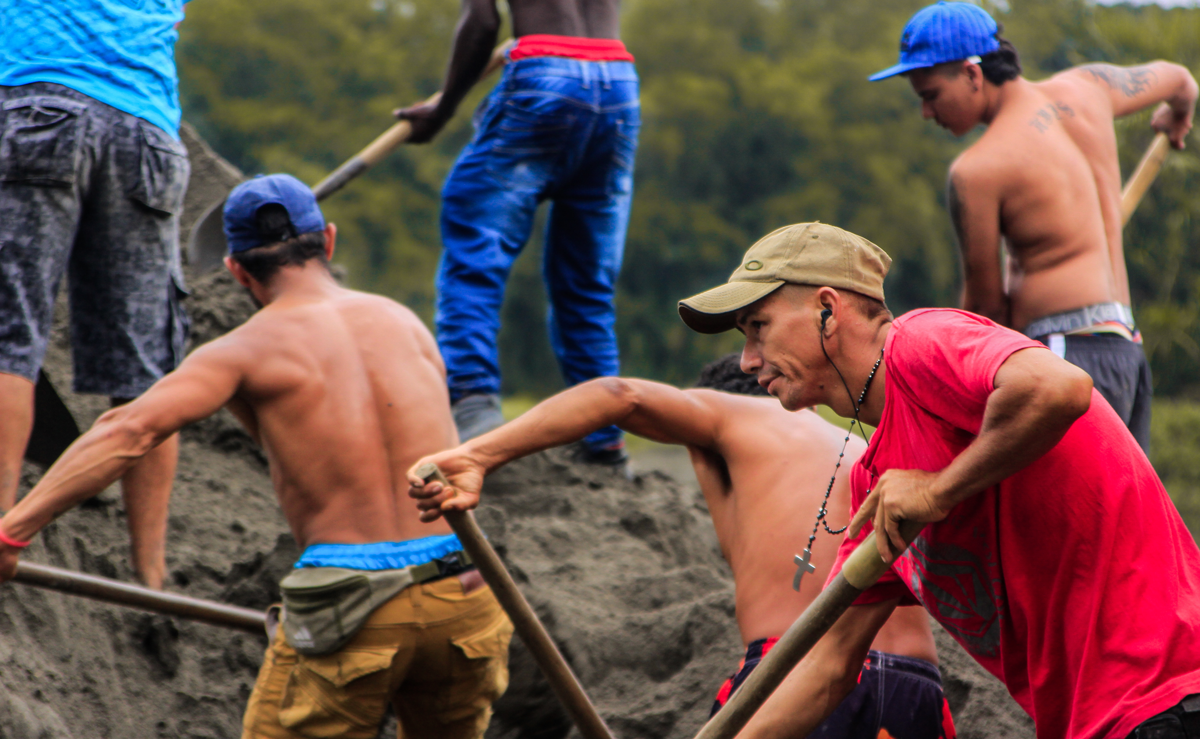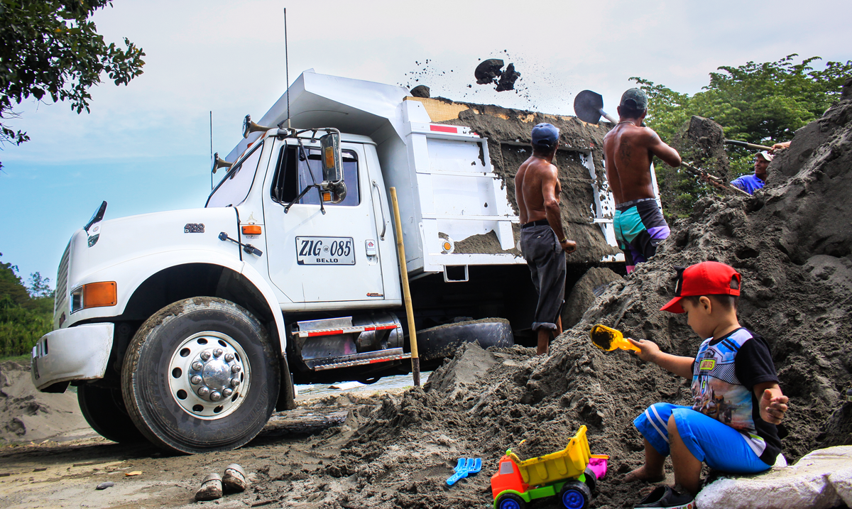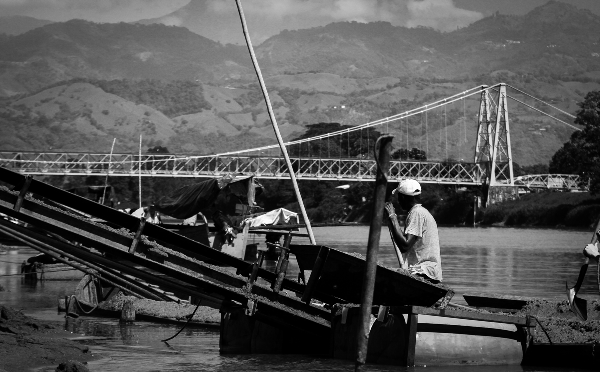 Hacia el norte del viejo puente Bernardo Arango, en Caimalito, se encuentra una playa de 350 metros de largo donde písamos, samanes, cauchos y vainillos crean una atmósfera casi irreal cuando dejan cruzar escasos rayos de sol en medio del follaje. Allí, justo a la orilla del río, se extienden ocho bandas, como se les llama a las cintas mecánicas que ayudan a subir el material desde allí hasta las volquetas pertenecientes a firmas constructoras o a pequeños empresarios. Alrededor de ellas, docenas de hombres de diferentes edades mueven rítmicamente sus palas, otros permanecen a la espera en improvisadas casetas distanciadas de la orilla, algunos más observan o solo hacen pereza en los escaños hechos con guadua.