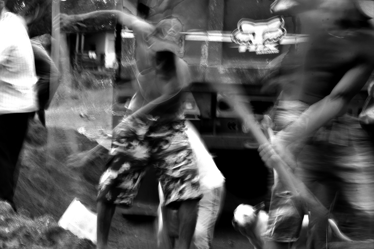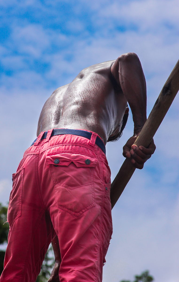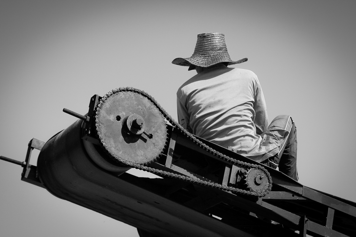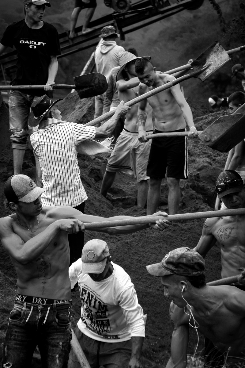Hacia el norte del viejo puente Bernardo Arango, en Caimalito, se encuentra una playa de 350 metros de largo donde písamos, samanes, cauchos y vainillos crean una atmósfera casi irreal cuando dejan cruzar escasos rayos de sol en medio del follaje. Allí, justo a la orilla del río, se extienden ocho bandas, como se les llama a las cintas mecánicas que ayudan a subir el material desde allí hasta las volquetas pertenecientes a firmas constructoras o a pequeños empresarios. Alrededor de ellas, docenas de hombres de diferentes edades mueven rítmicamente sus palas, otros permanecen a la espera en improvisadas casetas distanciadas de la orilla, algunos más observan o solo hacen pereza en los escaños hechos con guadua.