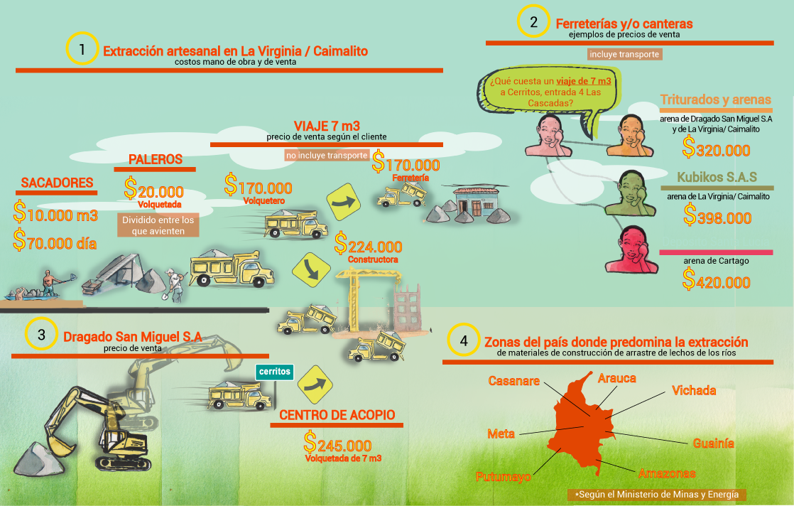 La ANM asigna y controla los volúmenes de extracción permitidos; mientras la CARDER monitorea el plan de manejo y vigila que se cumpla la norma ambiental. Además, tanto la draga como los areneros artesanales deben cumplir con el Registro Único de Comercialización, RUCOM, un instrumento que formaliza la venta de materiales.