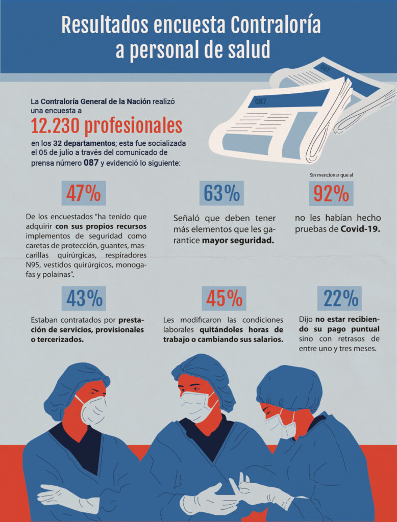 Desde que empezó la emergencia sanitaria en Colombia, el personal médico del país y sindicatos como la Asociación Nacional Sindical de Trabajadores y Servidores Públicos de la Salud y Seguridad Social Integral y Servicios Complementarios de Colombia (ANTHOC) manifestaron gran preocupación por la ausencia de Elementos de Protección Personal (EPP) y, en consecuencia, presentaron denuncias al Ministerio del Trabajo.