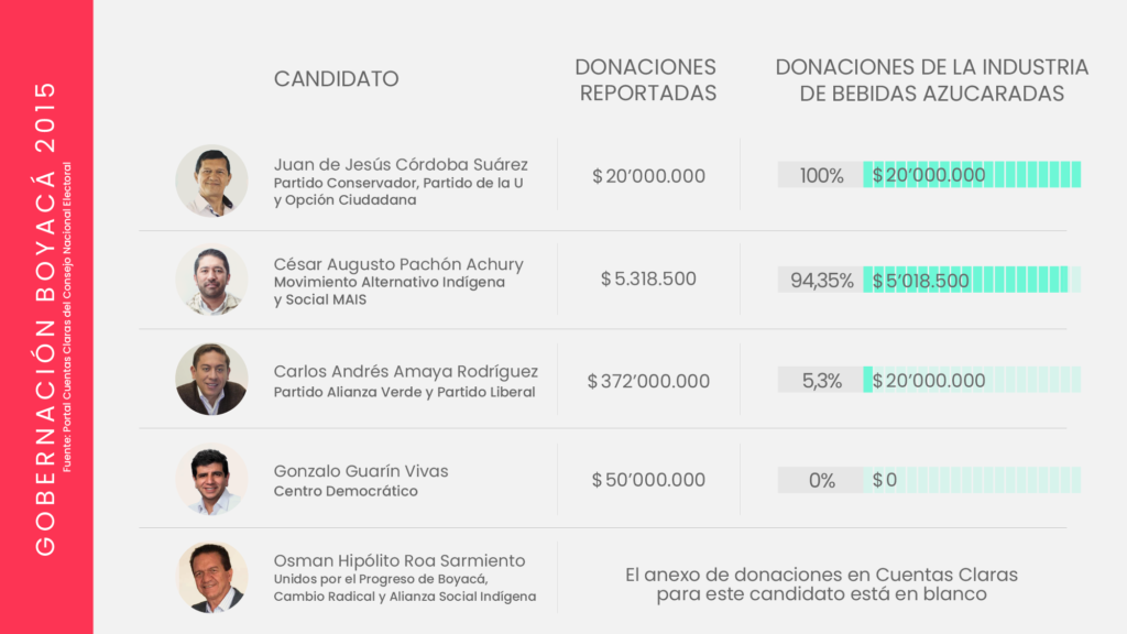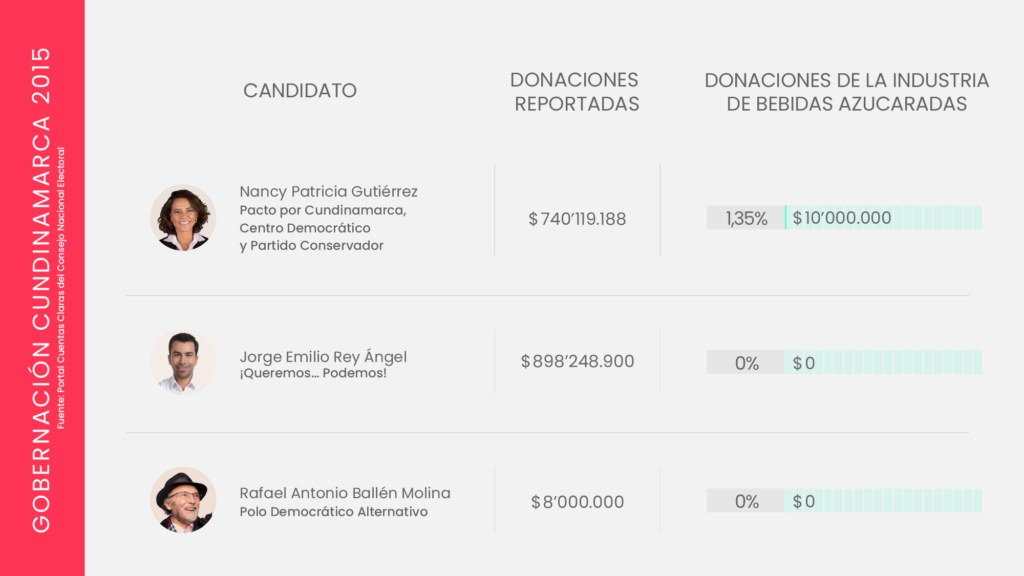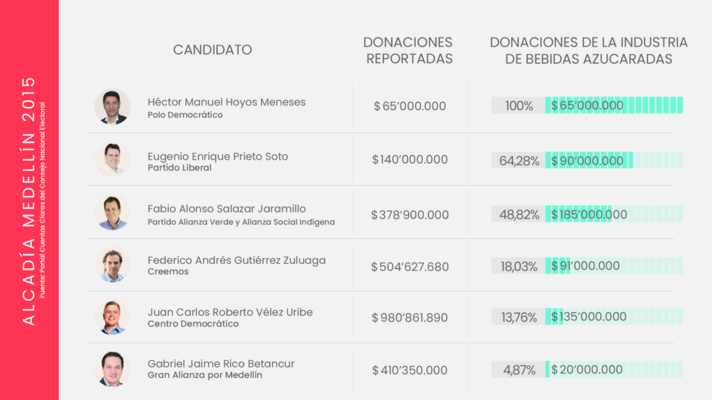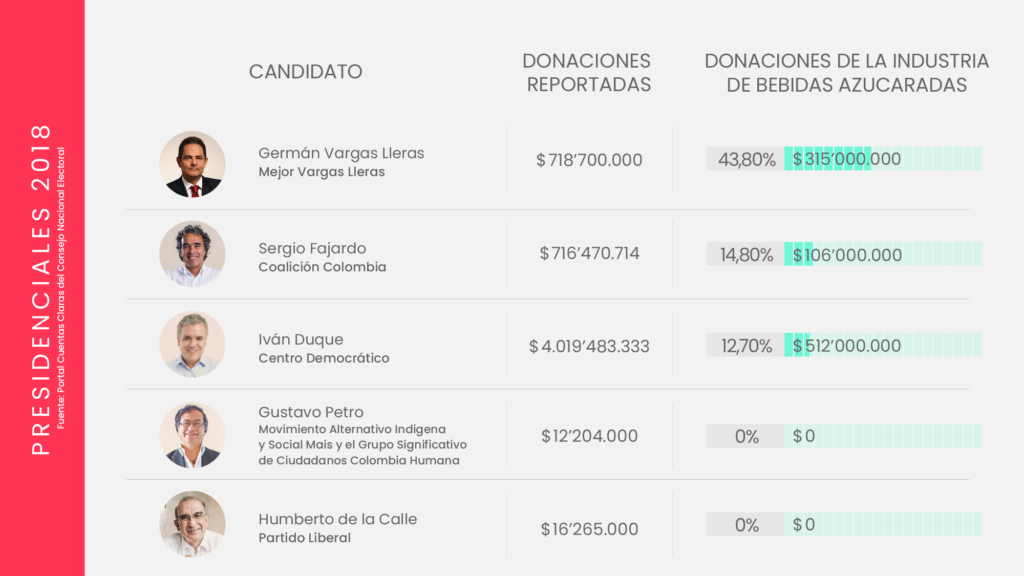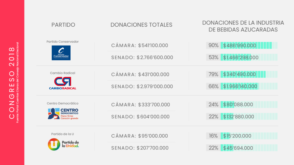 La industria de bebidas azucaradas y comida altamente procesada invierte miles de millones de pesos en campañas políticas. Aunque cubre un amplio abanico de movimientos y partidos, suele concentrar sus donaciones en el centro y la derecha del espectro político; particularmente el Centro Democrático, el Partido Conservador y Cambio Radical, los partidos que después protegen los intereses de la industria, como lo ha demostrado su oposición en el Congreso, a propuestas como el impuesto a las bebidas azucaradas, y la ley para introducir un etiquetado de advertencia en los alimentos.