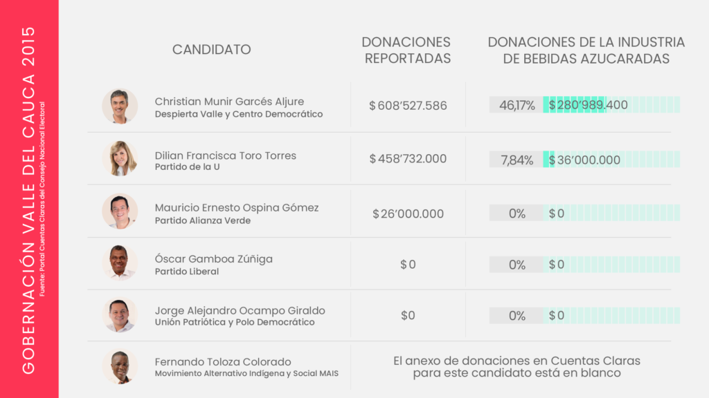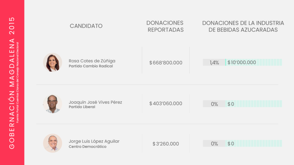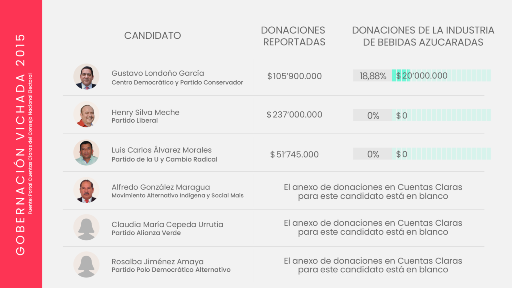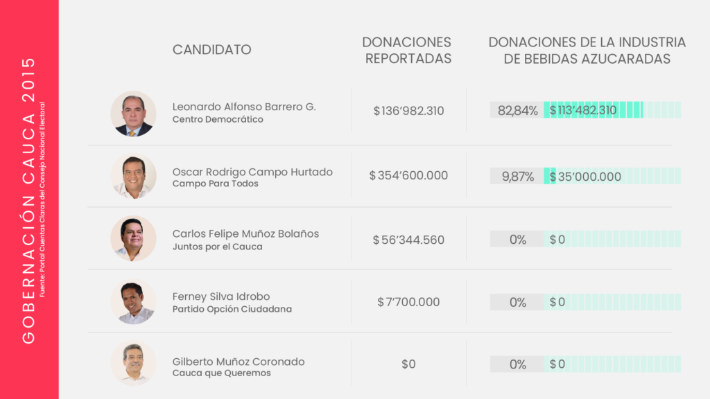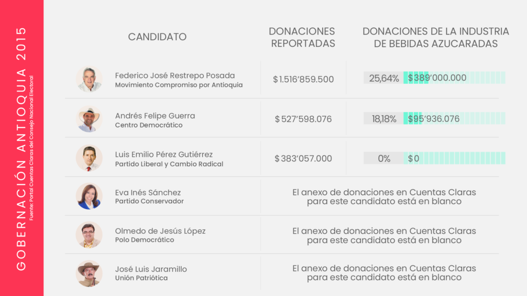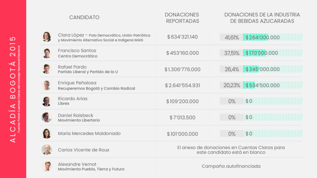 La industria de bebidas azucaradas y comida altamente procesada invierte miles de millones de pesos en campañas políticas. Aunque cubre un amplio abanico de movimientos y partidos, suele concentrar sus donaciones en el centro y la derecha del espectro político; particularmente el Centro Democrático, el Partido Conservador y Cambio Radical, los partidos que después protegen los intereses de la industria, como lo ha demostrado su oposición en el Congreso, a propuestas como el impuesto a las bebidas azucaradas, y la ley para introducir un etiquetado de advertencia en los alimentos.
