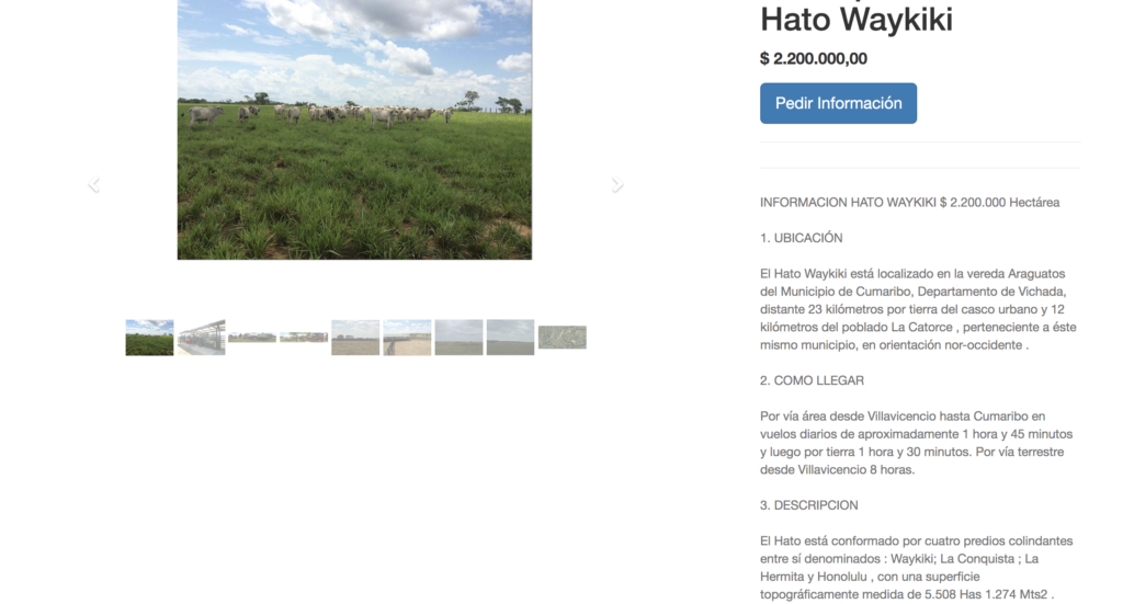 Así, Lufema y Zagapa lograron concentrar 5.500 hectáreas en una sola finca conocida como “Hato Waykiky”. La propiedad, que cuenta con unas 500 cabezas de ganado, estaría a la venta por un valor cercano a los 12 mil millones de pesos (2,2 millones por hectárea), según aparece en un portal de finca raíz. (Ver foto). Mora Sarria, sin embargo, negó que los predios estén en venta y dijo desconocer quién publicó el anuncio.