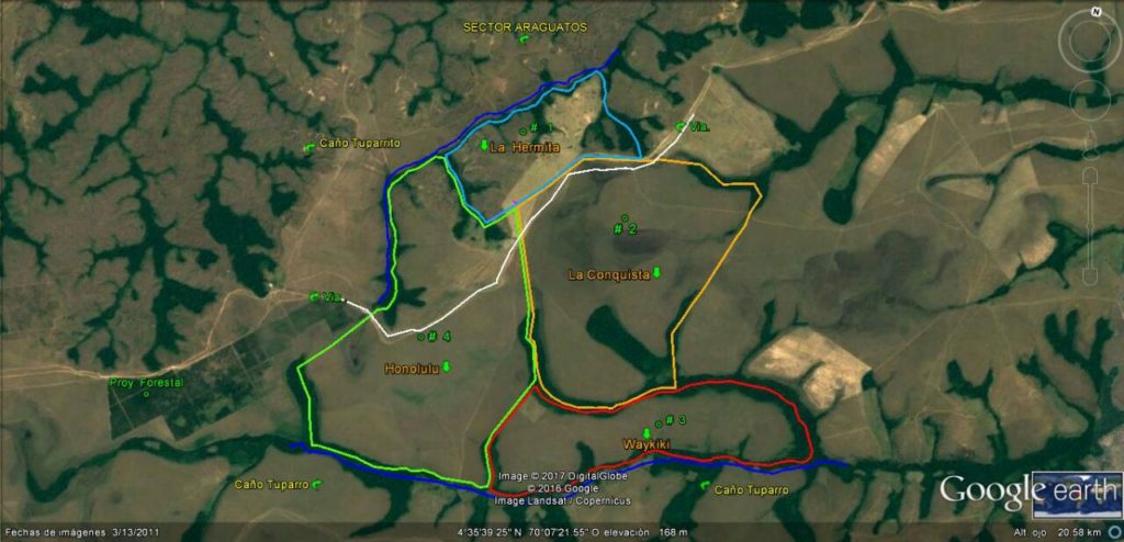 “El Hato está conformado por cuatro predios colindantes entre sí denominados: Waykiki (sic); La Conquista; La Hermita y Honolulu, con una superficie topográficamente medida de 5.508 Has […] Además de los caños que delimitan el Hato, la vecindad está conformada por predios privados donde se encuentran desde hace varios años programas forestales (Caucho Natural; Pino Caribbean y Eucalipto ) y ganadería”, dice el aviso publicado por los vendedores.