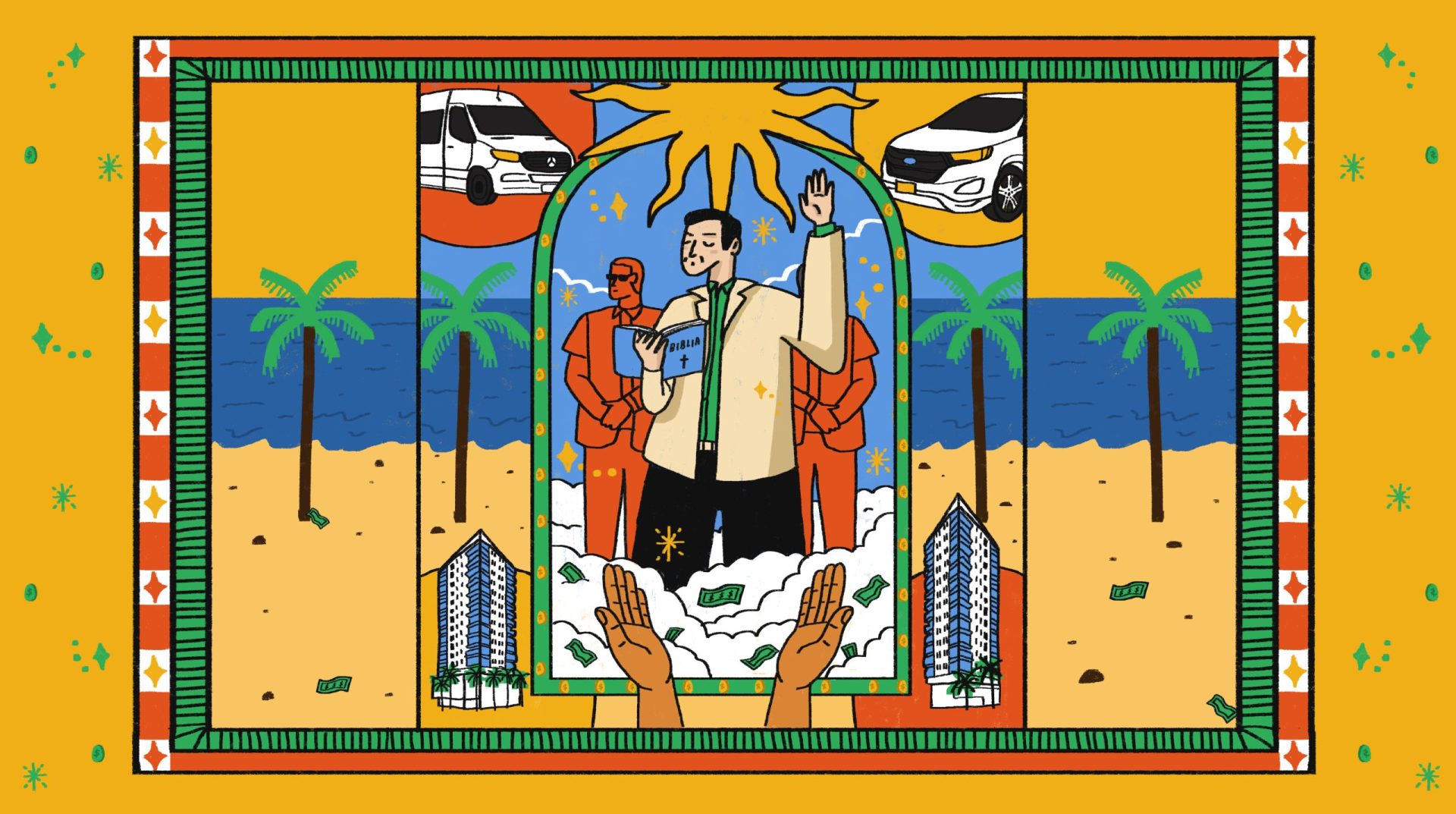Esteban Acosta, autodenominado apóstol; y su esposa, la pastora Lisbeth Bello, convencen a sus seguidores de hacer donaciones a cambio de favores religiosos, mientras ellos amasan fortunas para costear una vida de lujos. Para eso emplean estrategias de mercadeo y un mensaje reiterativo cuya promesa es simple: cuanto más dinero le den a Dios a través de ellos, más progreso tendrán en la tierra como recompensa. Lo llaman el “evangelio de la prosperidad”.
