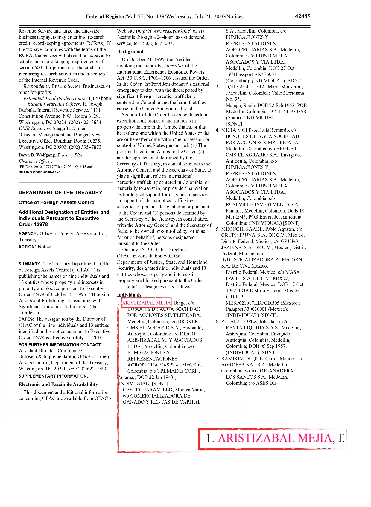 [Imagen 1: Diego Aristizábal en la Lista Clinton del Departamento del Tesoro de Estados Unidos]