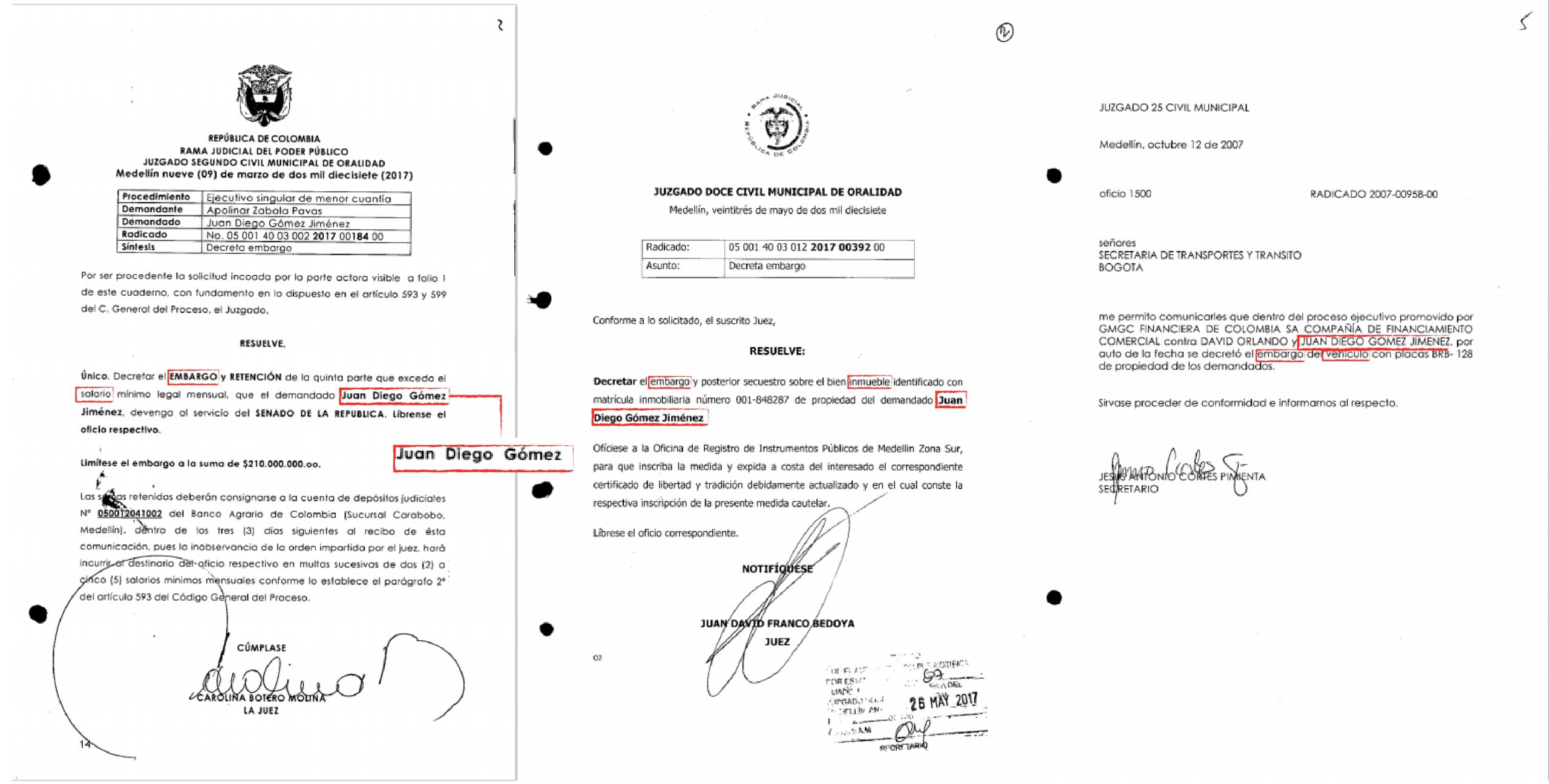 [Imagen 3: Al nuevo presidente del Senado, Juan Diego Gómez, le embargaron el sueldo, el apartamento y el carro.]