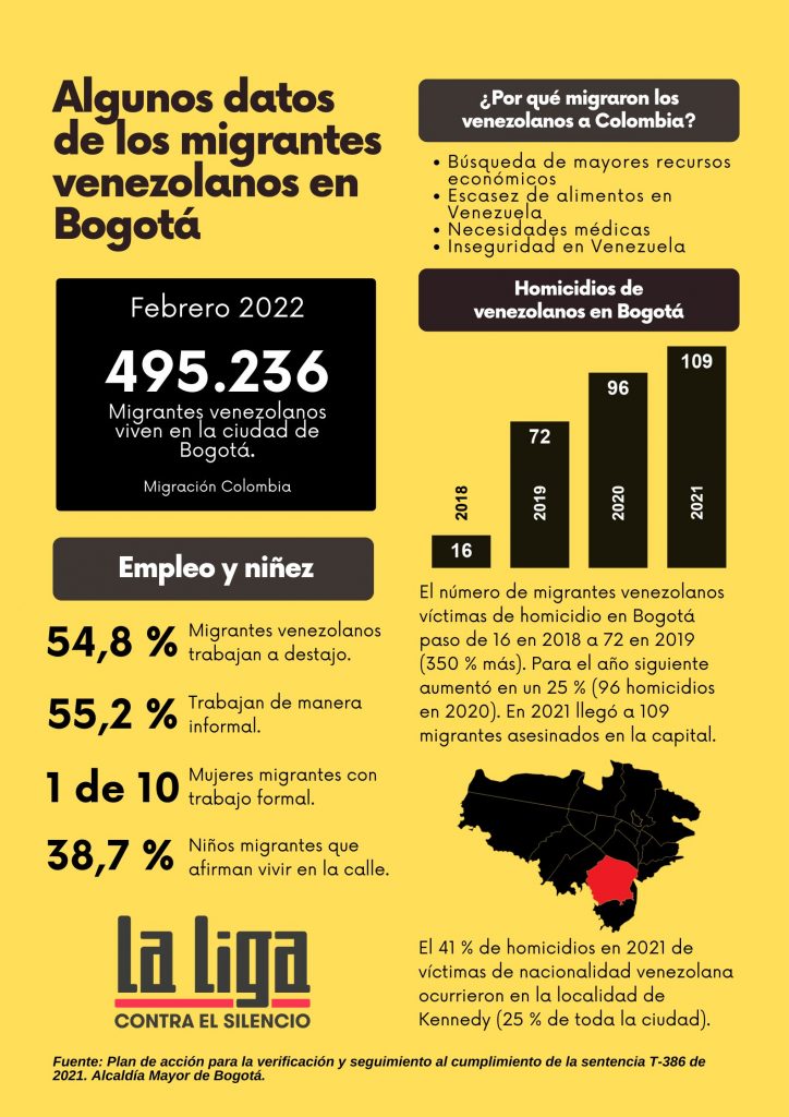 El número de venezolanos asesinados en Bogotá ha aumentado cada año. Pasó del registro de uno en 2016, a 72 en 2019, y a 109 en 2021, según cifras de la Alcaldía de Bogotá. A nivel nacional, la tasa de homicidios de venezolanos también aumentó y casi se duplicó en dos años. Un análisis de datos de Medicina Legal, el Departamento Administrativo Nacional de Estadística (DANE) y Migración Colombia muestra que la tasa de homicidios contra estos migrantes casi duplica la de colombianos asesinados.