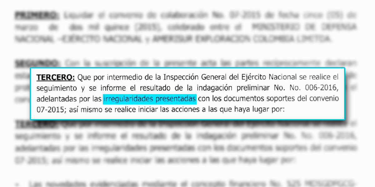 Además se identificaron casos donde la empresa manifiesta no tener soporte de algunos gastos por parte de la entidad pública. Un ejemplo es el convenio 006 -2016, suscrito entre Amerisur Exploration y el Ministerio de Defensa. En el acta, la empresa manifiesta irregularidades en los documentos de gastos por 639 millones de pesos, y solicita Inspección General del Ejército porque no hay soportes de algunos gastos.