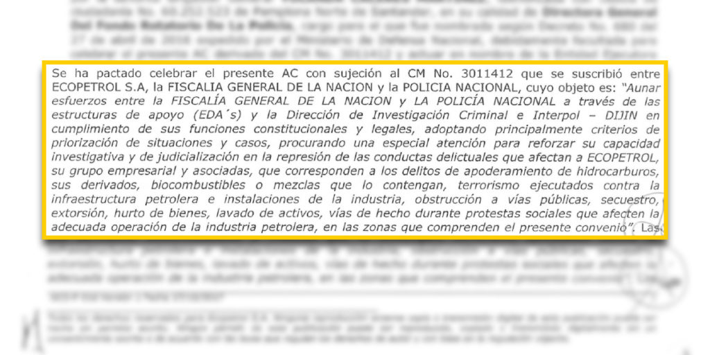 Cuando se trata de acuerdos con la Fiscalía, todas las partes que firman aportan recursos. A su vez, la Fiscalía se compromete a priorizar casos y poner especial atención en reforzar su capacidad investigativa y de judicialización en la represión de delitos que afecten las operaciones de las empresas, como está registrado en el convenio entre las Estructuras de Apoyo y Ecopetrol.