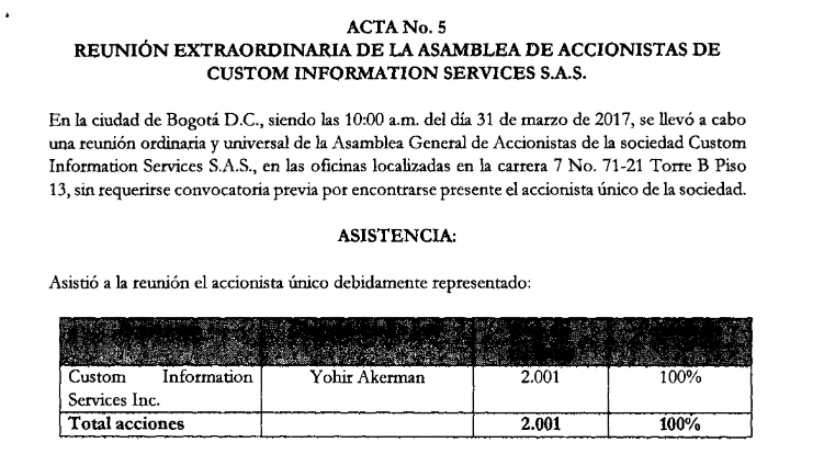 El nombre de Akerman aparece por primera vez en 2017. El 31 de marzo de ese año se adelantó una asamblea de accionistas de CIS y el columnista asistió como representante de Custom Information Services INC. Es decir, recibió el poder de la compañía accionista con sede en Miami para representarla en la reunión de su filial en Colombia. Así quedó consignado en el Acta #5 de CIS.
