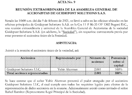 El 9 de febrero de 2021 se llevó a cabo una reunión extraordinaria de accionistas de Guidepost Solution S.A.S. Su único accionista es Guidepost Solutions LLC y el representante era Yohir Akerman, quien fue elegido gerente. En esta reunión hicieron un cambio en el modo de escogencia de representante legal. Fuente: Acta #9.
