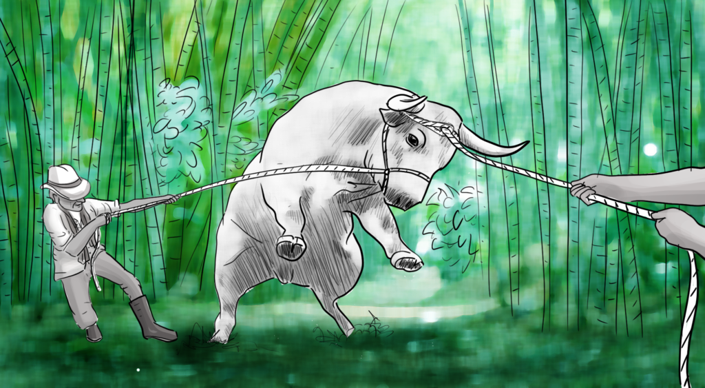 Párame aquí, le dije, y me puse a filmar la escena con la Canon. Los dos hombres sudaban como bestias tratando de menearlo con la soga y tirándole el rejo por los cuernos, pero el torete no cedía. Bufaba y enterraba los cachos en una estaca de guadua, ah jijuemadre decía uno y yo enfoqué la toma en zoom directo a los guaduales que se veían muy bonitos con ese sol de los venados dándoles de puro frente y el río medio seco con las piedras enormes parecía una postal me va a quedar como de festival carajo y entonces se me ocurrió el picado desde arriba y caminé hasta el puente.