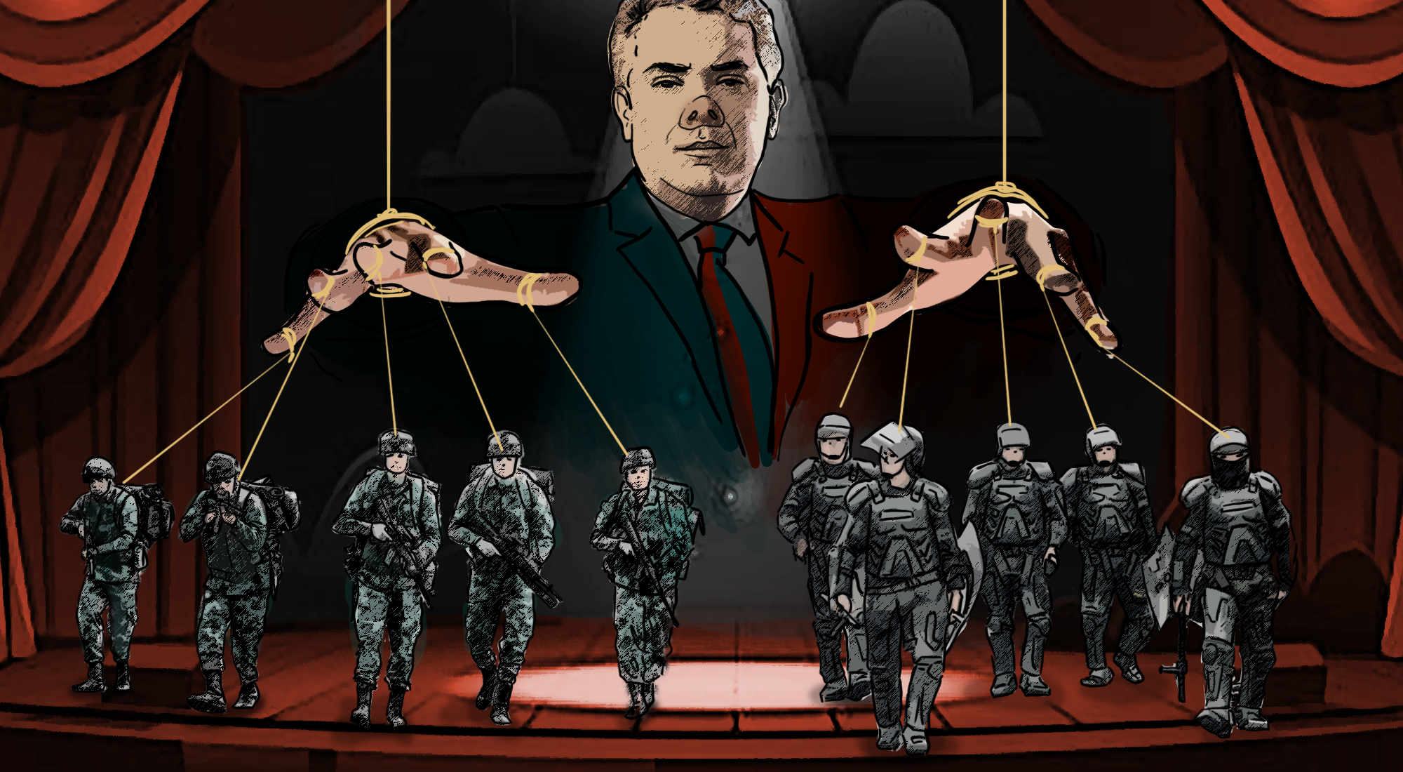 Los títeres se autodefienden hasta convivir con fuerza brutal. Desde pájaros hasta águilas negras al teatro violan con furia y un títere matarife a falsos positivos empieza a exterminar con una manta de seguridad democrática como disfraz.