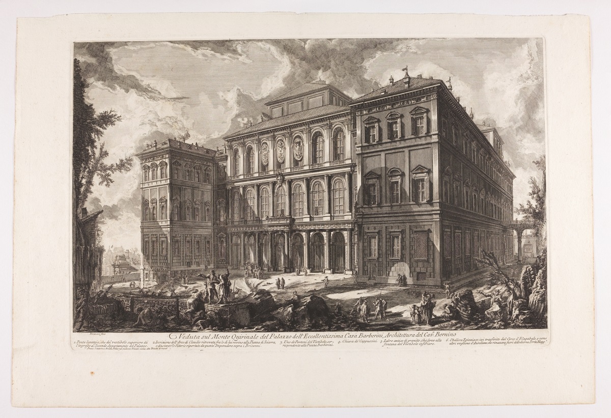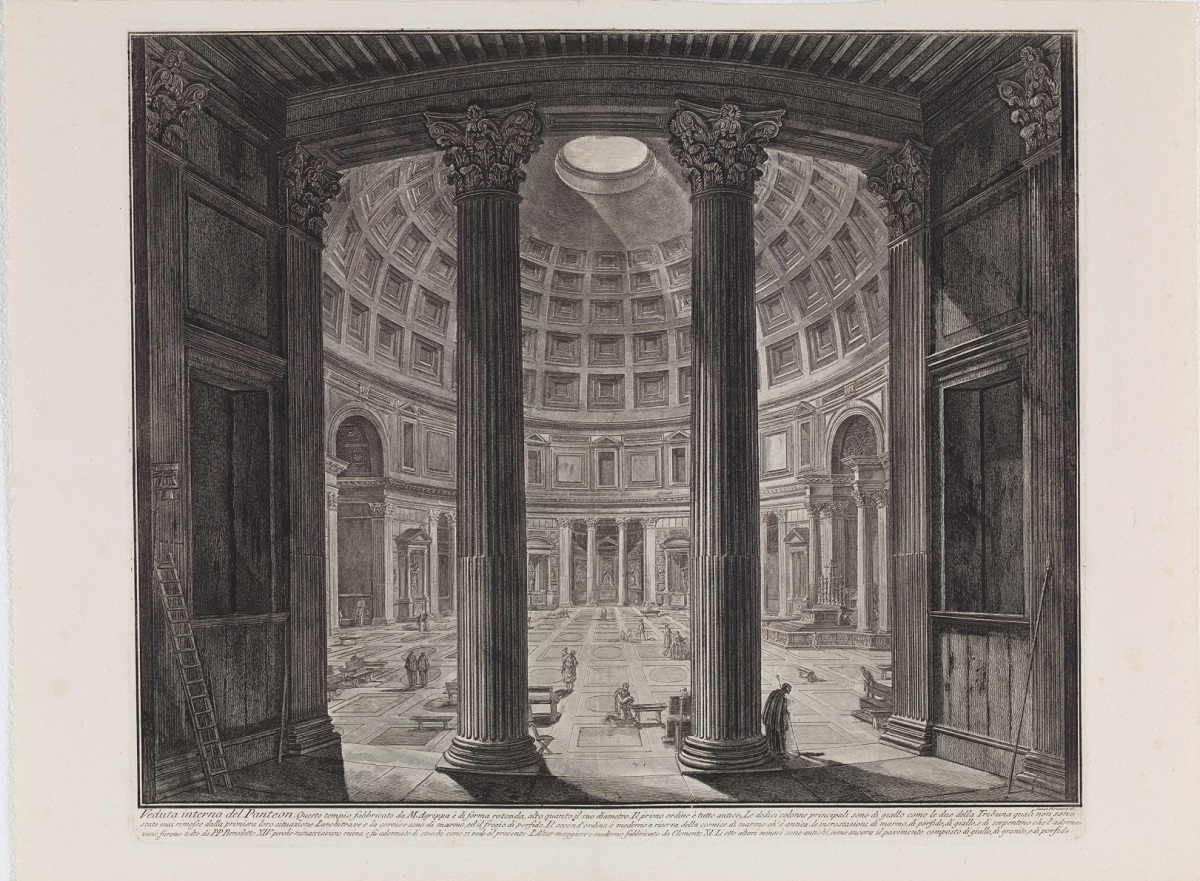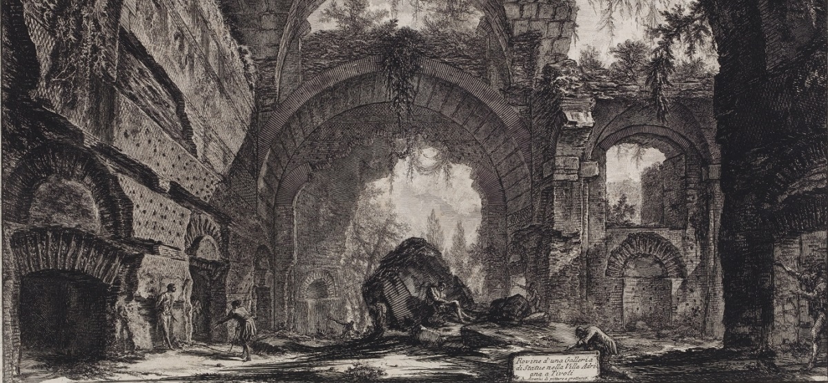 Giovanni Battista Piranesi (Venecia, 1720 – Roma, 1778) en sus grabados a blanco y negro hace ver lejano al hombre, tan lejano que a lo sumo es una sombra que se alarga, una sombra que se tiende y desaparece en medio de los arcos y las columnas dóricas. A sus veintitrés años el artista se trasladó a Roma como delineante del embajador veneciano Marco Foscarini y publicó su primera gran serie de estampas, Prima Parte di Architetture, e Prospettive inventate, en 1743, fascinado por las ruinas del imperio romano, por la escala heroica y monumental de la arquitectura antigua.