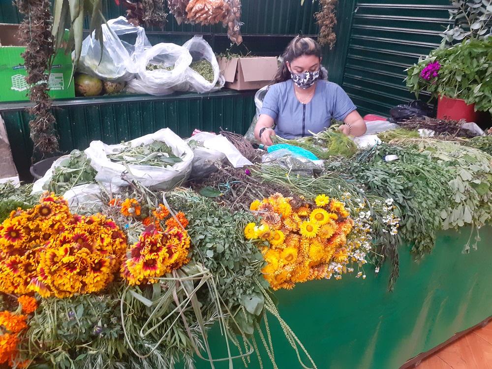 “A la orden, ¿qué buscaba?”, es como recibe ella a sus clientes, con tono de quien ha repetido la misma frase tantas veces que ya la dice automáticamente cuando alguien se acerca a su local, sin perder el toque amable. Trabaja aquí desde hace 20 años vendiendo hierbas para remedios y sahumerios. A través de los lentes rectangulares de sus gafas, como si estos le mostraran la dimensión espiritual de las plantas, ubica, entre los cientos de hierbas que llenan las paredes de su negocio, la que es adecuada para el mal que les aqueja a sus clientes.