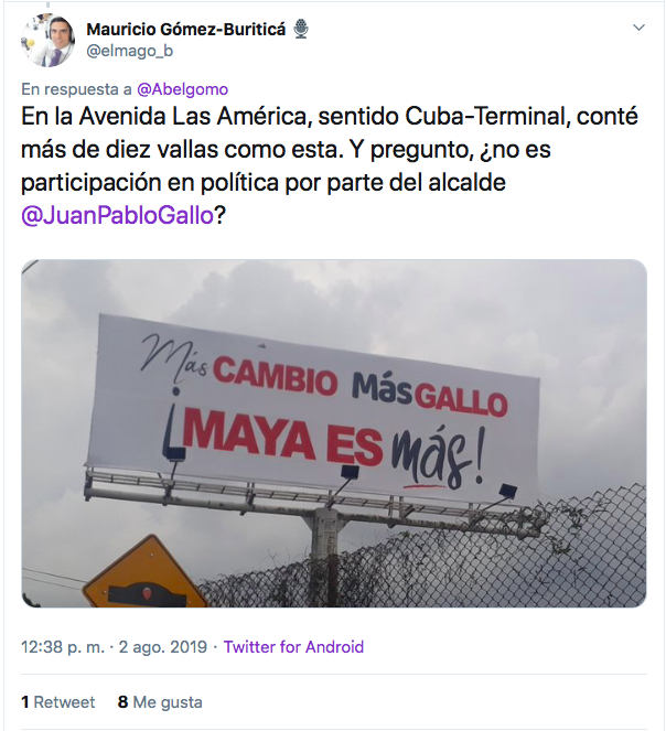 El periodista Mauricio Gómez Buriticá publicó el 3 de agosto en Twitter la fotografía de una de estas vallas publicitarias con el siguiente mensaje: “En la Avenida Las América (sic), sentido Cuba – Terminal, conté más de diez vallas como esta. Y pregunto, ¿no es participación en política por parte del Alcalde?”.