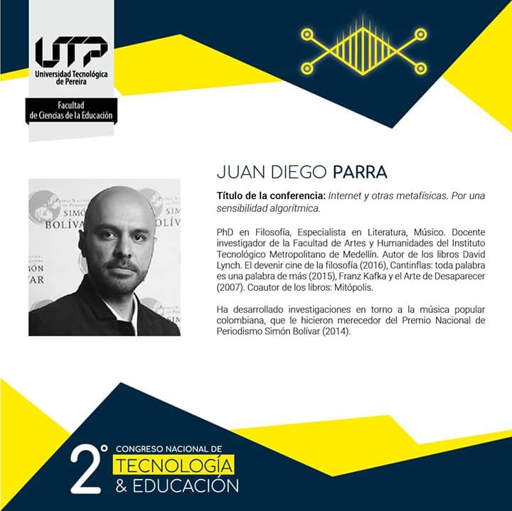 Entre las conferencias centrales, se encuentra la de Juan Diego Parra, quien fue premio de periodismo Simón Bolívar en el 2016, por el estudio de las músicas nacionales. Él hablará en el congreso sobre “Internet y otras metafísicas. Por una sensibilidad algorítmica”.