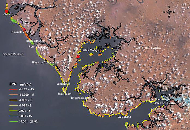Como balance, el mar avanzó un promedio de 21 cm por año sobre el área de estudio, con valores máximos de acreción del orden de los 26,92 m, y de 21,01 m de erosión . La mayor afectación se encontró en la Playa el Choncho (Valle), en donde el mar se desplazó cerca de 624 m entre 1986 y 2001. “La población que vivía en este lugar sufría por inundaciones y tuvo que ser reubicada por el Gobierno nacional”, explica la investigadora Cifuentes.