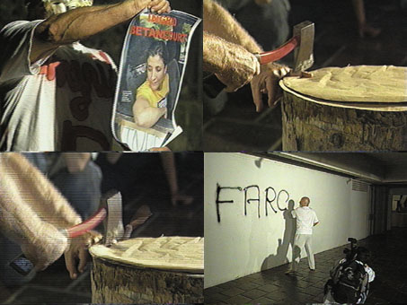 Con sigilo Pinoncelli descendió unas escaleras que conducían a un recinto abierto. Se encerró en la jaula de madera, salió de ella y ante una bicicleta hizo un gesto con el puño cerrado (una posible referencia a su travesía en bicicleta desde Francia hasta la China de Mao Tse Tung). Se fue despojando de la negra vestimenta para mostrar las demás ropas que llevaba puestas, como si fuera él una caja china: el disfraz arlequinesco, la camiseta que luce el nombre abreviado de la candidata y al final su atuendo más sobrio. Con ayuda de otro asistente extrajo una paloma blanca de una pequeña jaula, la tomó en sus manos y la echó a volar. Seguidamente extendió los brazos en forma de cruz y enseñó a la audiencia la foto impresa de Betancourt. Se deshizo de las máscaras calavéricas, luciendo una cabeza rapada, en el rostro los colores de las banderas de Colombia y Francia y en la frente una cruz blanca. Luego entró en una sala del museo. Apoyó el dedo meñique de su mano izquierda sobre un bloque de madera, tomó el hacha y la descargó una vez, y otra vez. Con la sangre que brotaba garabateó un corazón sobre su camiseta. Entonces, como si nada, tomó el aerosol con su mano derecha, lo agitó y escribió en una de las blancas paredes la palabra FARC y la salpicó varias veces con la sangre que manaba de su dedo mutilado. Levantó su puño derecho. Tomó la cercenada falange superior de su meñique y se la metió en su boca como si fuera a tragarla. Luego la escupió sobre un trapo blanco, destapó un frasco de formol y la vertió en él. Ante un público atónito enseñó su dedo amputado.