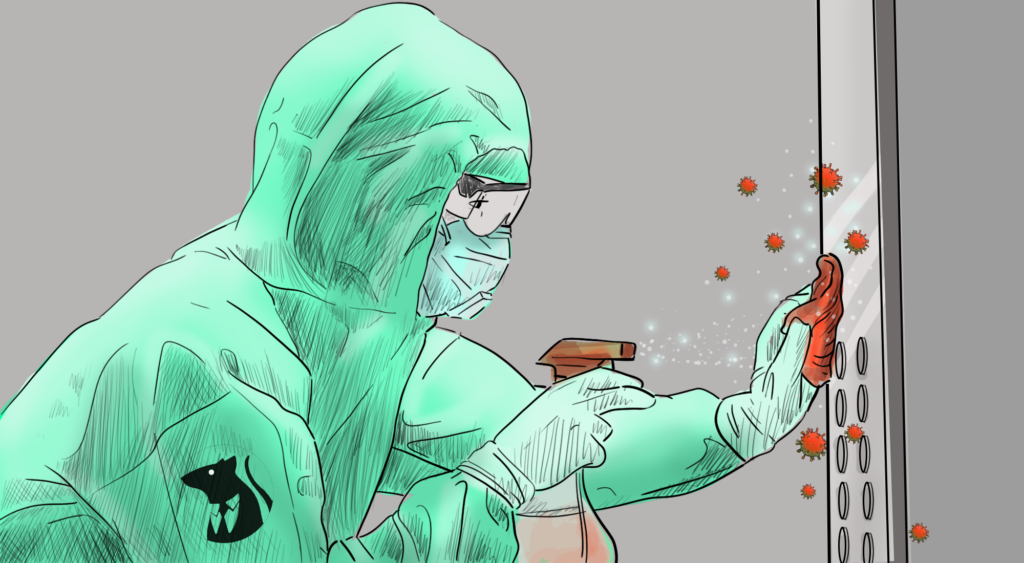 Me toca hacer desinfección cuando entra un COVID. Lo primero son los implementos de seguridad. Cuando uno está bien vestido inmediatamente hace la ruta COVID: toca ir haciendo aspersión para ir desinfectando por donde va pasando el COVID; y cuando llega a la sala uno se queda afuera esperando que salga, después uno espera 20 minutos para ingresar a hacer el aseo. Es más, me decían el COVID porque me tocaron hartos, ya me acostumbré, pero siempre con las medidas de seguridad, uno no puede bajar la guardia.