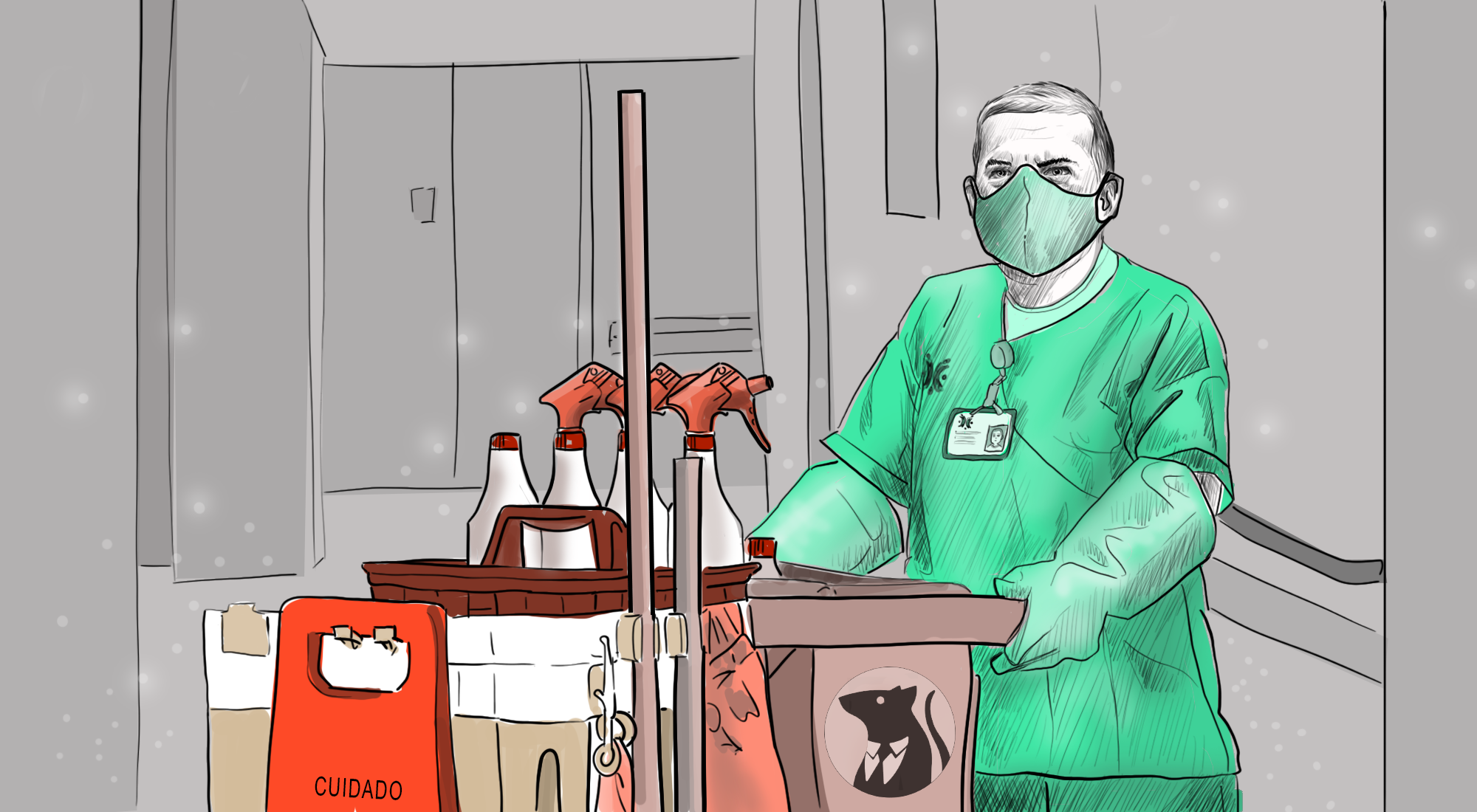 El personal de aseo, lo que le pasa es que no lo mencionan para nada, pero ellos son una labor muy bonita y muy importante para la parte hospitalaria, desde uno comienza el cuidado al COVID. Se incrementó mucho el trabajo porque como ya hay tantas desinfecciones. Todo el día hay que hacer desinfección. De uno depende que la demás gente no se vaya a infectar. Toca hacerlo al 100 % de bien el trabajo para que no vaya a quedar nada, de pronto por una cosita que se le quede a uno por ahí ya puede haber un infectado o varios.