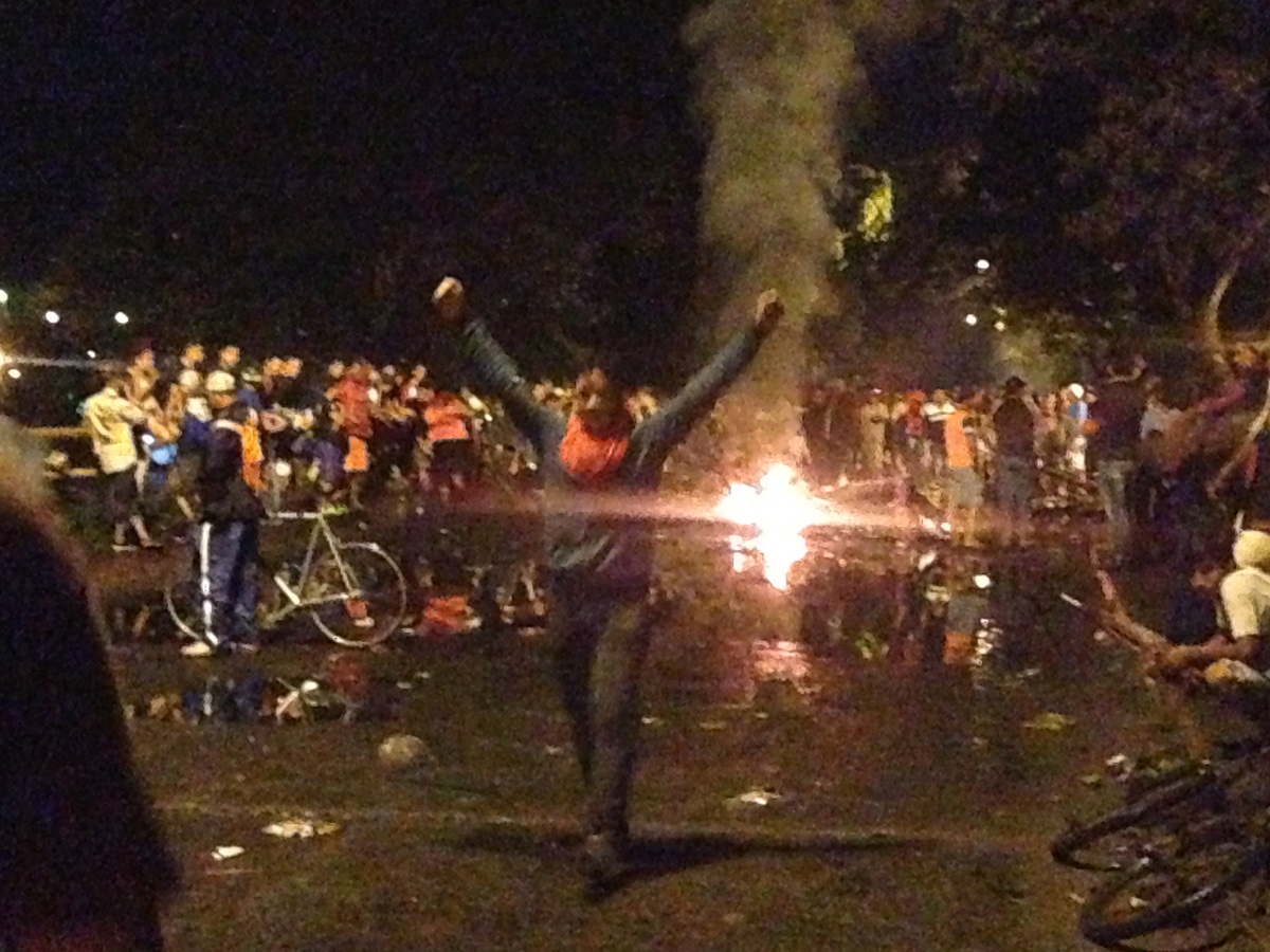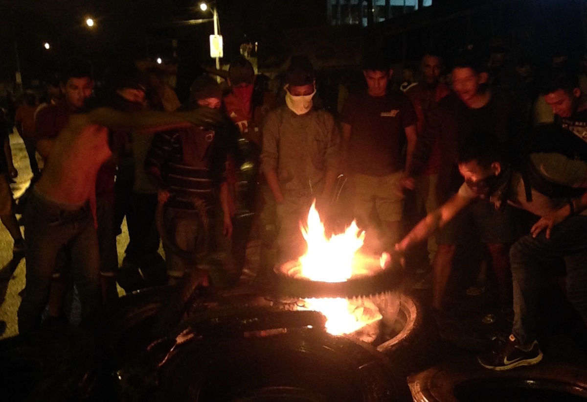 Después de 40 minutos de trayecto llegamos al peaje, el cual estaba tomado, lo habían incendiado, olía a caucho y las personas encapuchadas gritaban fuera JOH.
