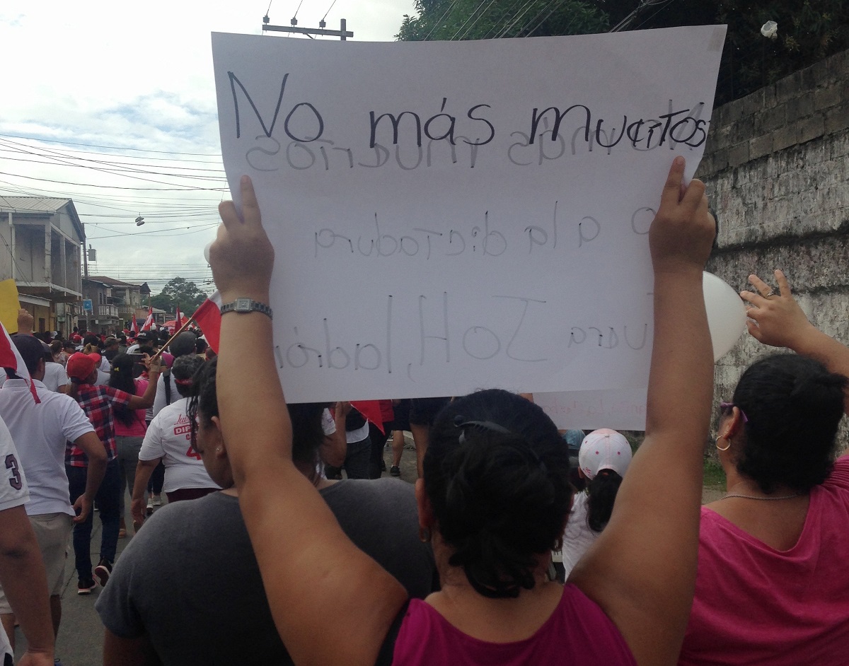 Empieza la marcha pacífica por la ciudad y la familia inunda las calles, con parlantes y pancartas, se protesta, canta, grita y suena el himno: “Ya me voy de mi país, aquí no puedo vivir porque si me quedo aquí, de hambre voy a morir, JOH,JOH, es pa fuera que vas. Si van a los hospitales, en busca de medicinas por una simple aspirina, nos dan pastillas de harina, JOH, JOH es pa fuera que vas, cuando llega el presidente, el pueblo grita ‘Que viva!’. A cada uno que grita, le dan cincuenta lempiras, JOH, JOH es pa fuera que vas”.