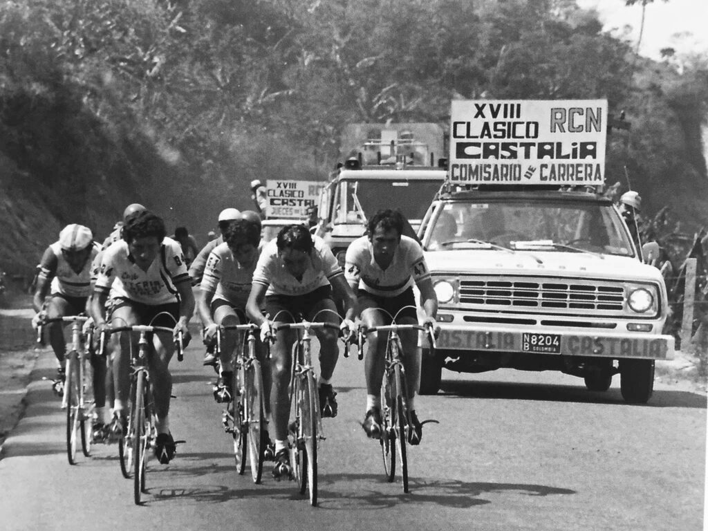 Yo arréelos, y arréelos, y arréelos, y ellos persiguiendo toda la subida, hasta que ya casi agarraban a Oscar. Me le arrimé a Pablo, le dije “a rueda mía, Pablo, siempre a rueda mía”. No más cazamos al grupito de Oscar, ¡pum!, nos fuimos los dos. Atrás quedaron chapaleando en un bullicio, nos gritaban mil cosas. Faltaban doce kilómetros para coronar el Alto de Rosas, y más de cuarenta para llegar al Estadio el Campín, en Bogotá, pero yo subía como un avión, a veces me tocaba esperar a Pablito.