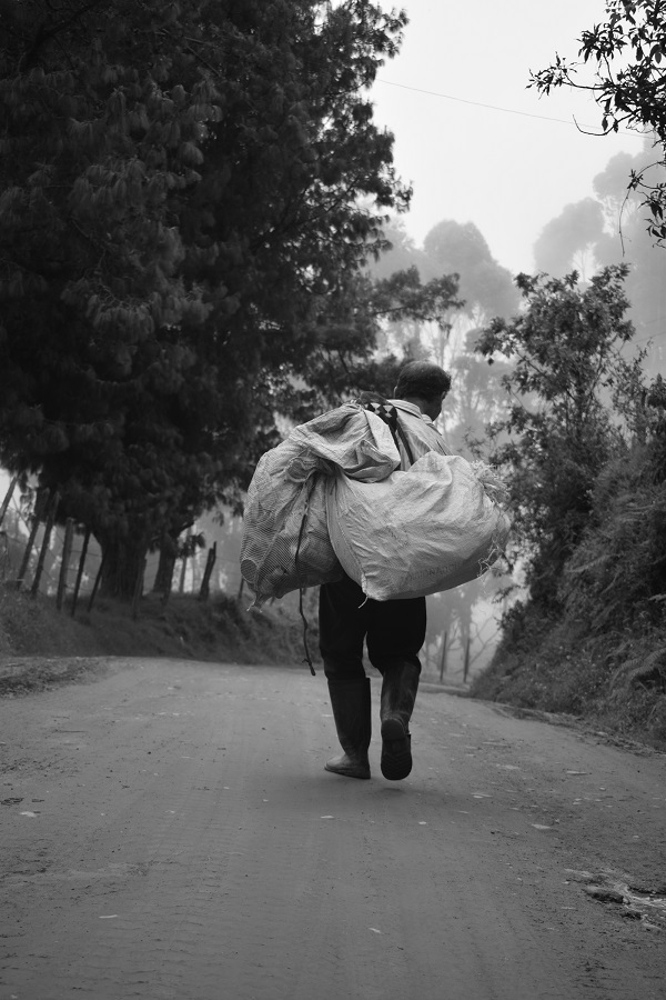 Nelson escucha el agua de una pequeña quebrada que baja de lo alto de la montaña, pero no el sonido de un radio ni la voz de Nelly Quintero Ocampo, la señora que, además de ser de las pocas vecinas, muy formalmente, cuando se encuentra en su casa, lo invita a pasar para que consuma un alimento y, cada vez que Nelson le pide que vaya a su acopio de basura, le ayuda a separar y a quebrar el vidrio de sus botellas, ya que Celeni, por una enfermedad que tiene en los pies, no puede. “La casa como que está sola… Parece, porque ahí no se oye nadie”, dice. “¡Niñaaaa!”, grita. Nadie le responde. Sigue su camino.