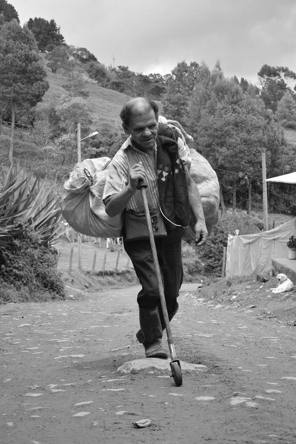 José Leonel camina en compañía de su esposa por las principales calles de Sonsón. Lleva la ropa de siempre: botas, pantalón negro y camisa a rayas. En su espalda tiene amarrados dos bultos repletos con tarros de gaseosa, aceite, límpido y en su hombro izquierdo una carga de varias cajas de cartón desbaratadas.