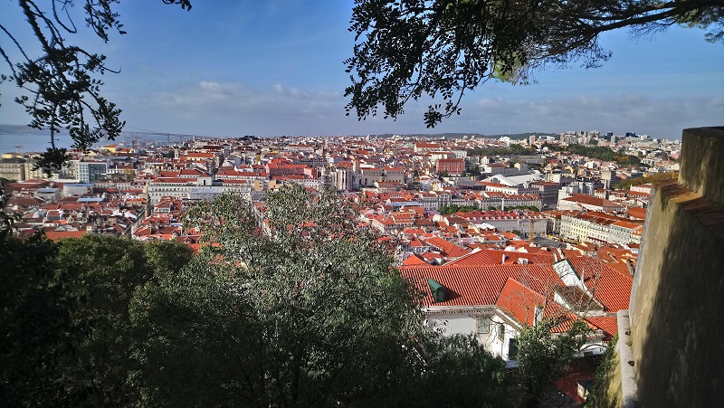 Me digo que el Castillo de San Jorge es el más bello de todos cuantos he visto en Europa. Es una extraña y paradójica belleza por todas las cosas terribles que pasaban en los castillos, que no eran exclusivamente idílicas. Es preciosa la Lisboa que tengo ante mis ojos, con sus techos anaranjados y rojizos, sus parques, sus viejos y señoriales edificios, el distrito multicolor de Alfama, el río Tajo al fondo, la promesa del mar, un cielo que ha ido aclarándose. Una ciudad que ha resistido invasiones, guerras, sismos y dictaduras.