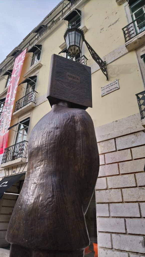 En Baixa descubro una estatua surrealista de un hombre-libro, literalmente, ante una casa blancuzca con una placa que dice: NO 4° ANDAR DESTA CASA NASCEU EM 13 DE JUNHO O POETA FERNANDO PESSOA. La cabeza de la estatua es un libro que dice Fernando Pessoa. Me pregunto si todo esto no será una novela suya, si mi propia vida no lo será, si estaré soñando que estoy viajando por Lisboa, si no seré un personaje más de sus novelas.