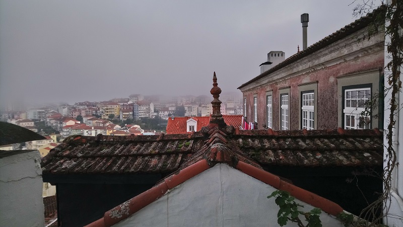 Un monumento al fado y sus sonidos que llegan de los bares. Ahora otra huella morisca, la Torre de Almedina, en el núcleo de la ciudad amurallada. Bares encantadores, pasadizos medievales. Una escultura femenina con cuerpo de mandolina, alegoría de ese instrumento de cuerda esencial en el fado, de una sensualidad embriagadora. Continúo mi paseo medieval hasta que una puerta me devuelve al centro neurálgico. Templos románicos. Ahora sí me encamino hacia mi alojamiento. Llego a mi cuarto de ventanas verdes y rosadas y paredes terracota y morado cobertor. Sueño con la ciudad o con otra que es como si fuera la misma. Al día siguiente, antes de partir, hago unas fotos desde la pequeña terraza. El día es frío y nubloso pero los techos lucen aún más bellos.