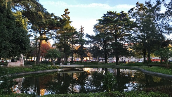 Me encamino ahora al parque Eduardo VII, en busca de la escultura de Botero La maternidad, pero lo que encuentro es esculturas con reminiscencias griegas. Ha caído la noche. Extenuado por toda la jornada empiezo a descender, cruzo la Plaza Marqués de Pombal, la misma por la que llegué a la ciudad a través de su estación de metro. Más tarde me entero de que la escultura boterina está en una sección del inmenso parque llamada Jardín de Amália Rodrigues, que era la que estaba a continuación y no quise visitar por la oscuridad y el cansancio. Al siguiente día, antes de abandonar mi alojamiento, contemplo desde mi ventana los viejos edificios de La Baixa, el céntrico barrio lisboeta.