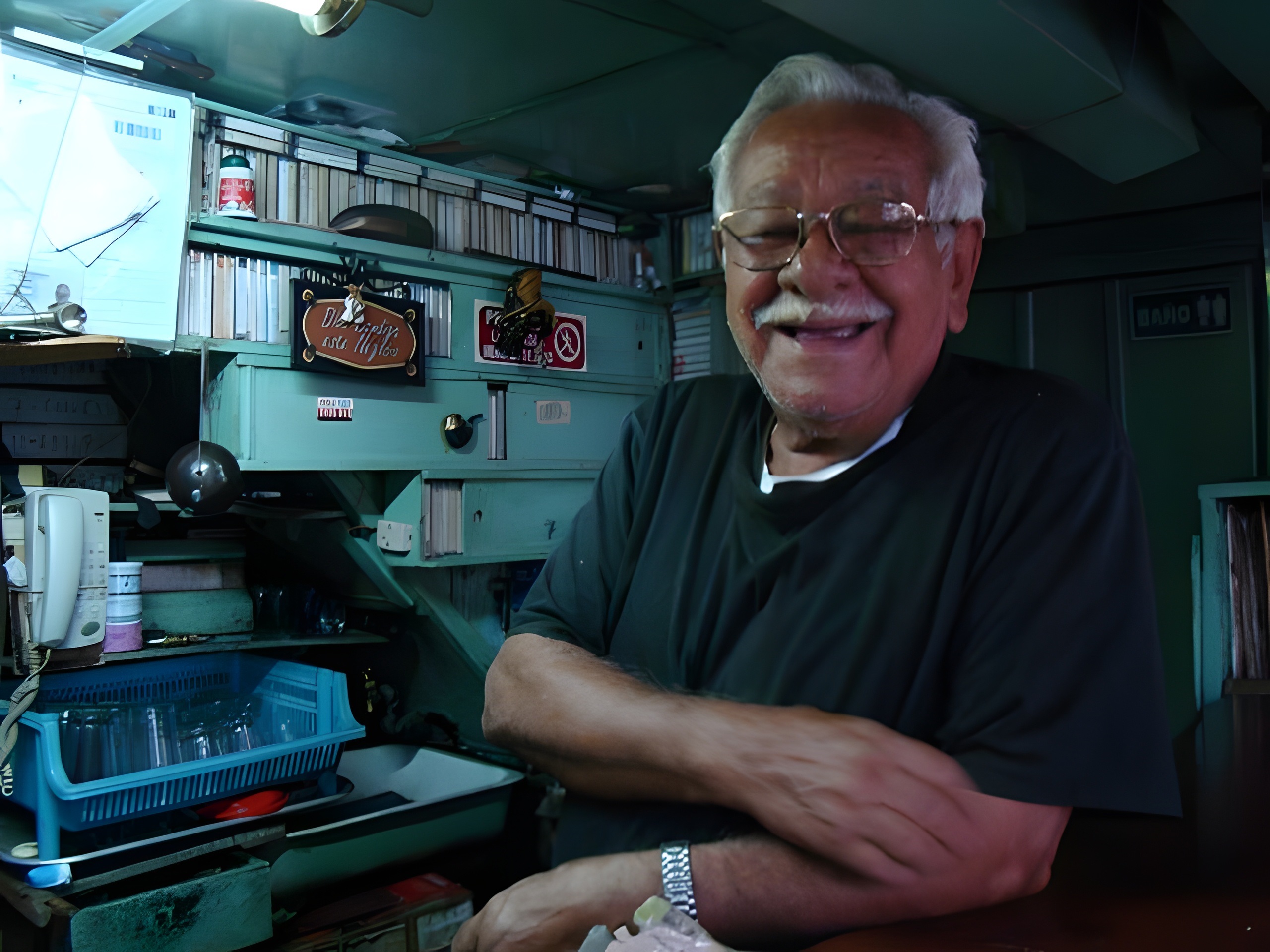 Al fondo está Olmedo, iluminado por una luz amarilla tenue que lo deja ver como un pequeño jerarca rodeado por miles de acetatos, que, entre música clásica, óperas, tangos, boleros y zarzuelas, se han convertido en la envidia y el deleite de visitantes que cada noche disfrutan cómo cae sobre el vinilo produciendo esa leve carraspera de la aguja y suelta esas suites de Bach que invaden el sitio. Ese momento es glorioso.