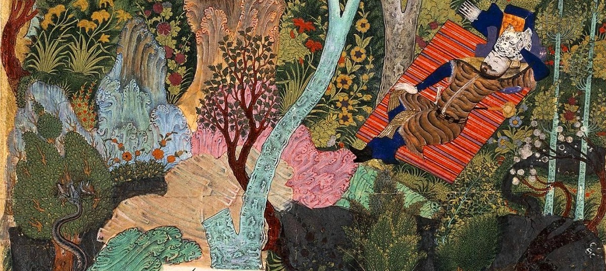Portada: Fragmento de Rustam duerme, mientras que su caballo Rakhsh se defiende de un león. 1515-22. Fuente: Wikipedia Commons.