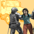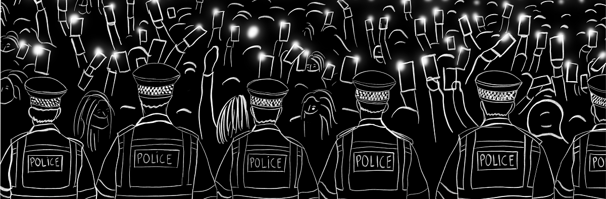 Como muchos otros, quedé muy impresionado con el horrífico crimen de un policía inglés que secuestró y asesinó a una joven de 33 años. Familia, amigos y diferentes organizaciones planearon una vigilia que fue cancelada a último momento por restricciones de covid en el Reino Unido. La policía terminó con la vigilia de forma violenta y con varios arrestos. La imagen está inspirada en una foto donde los asistentes a la vigilia iluminaban a la policía y les gritaban “vergüenza, vergüenza”.