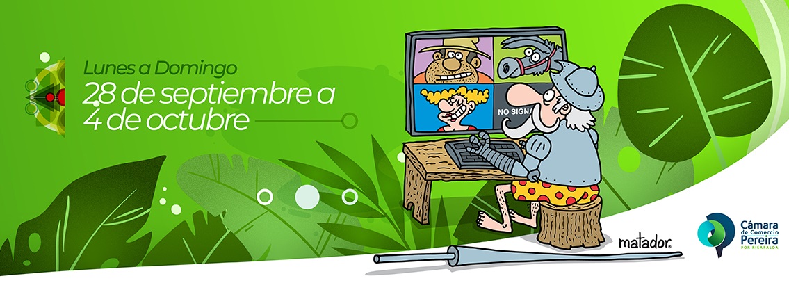 Esta es la caricatura –dibujada por Matador– que sintetiza mi sensación después de haber asistido a algunos espacios virtuales de la 6ª versión de la Feria del libro del Eje Cafetero: Paisaje, Café y Libro, entre la última semana de septiembre y la primera de octubre de este año 2020. Está el ingenioso hidalgo frente a la pantalla del computador. Sin adarga antigua, con la lanza no en astillero sino bajo un tronco, pero igual de seco de carnes, y cuya complexión recia se esconde en la armadura de la parte superior, aunque reluce con los boxers amarillos de pepas rojas.