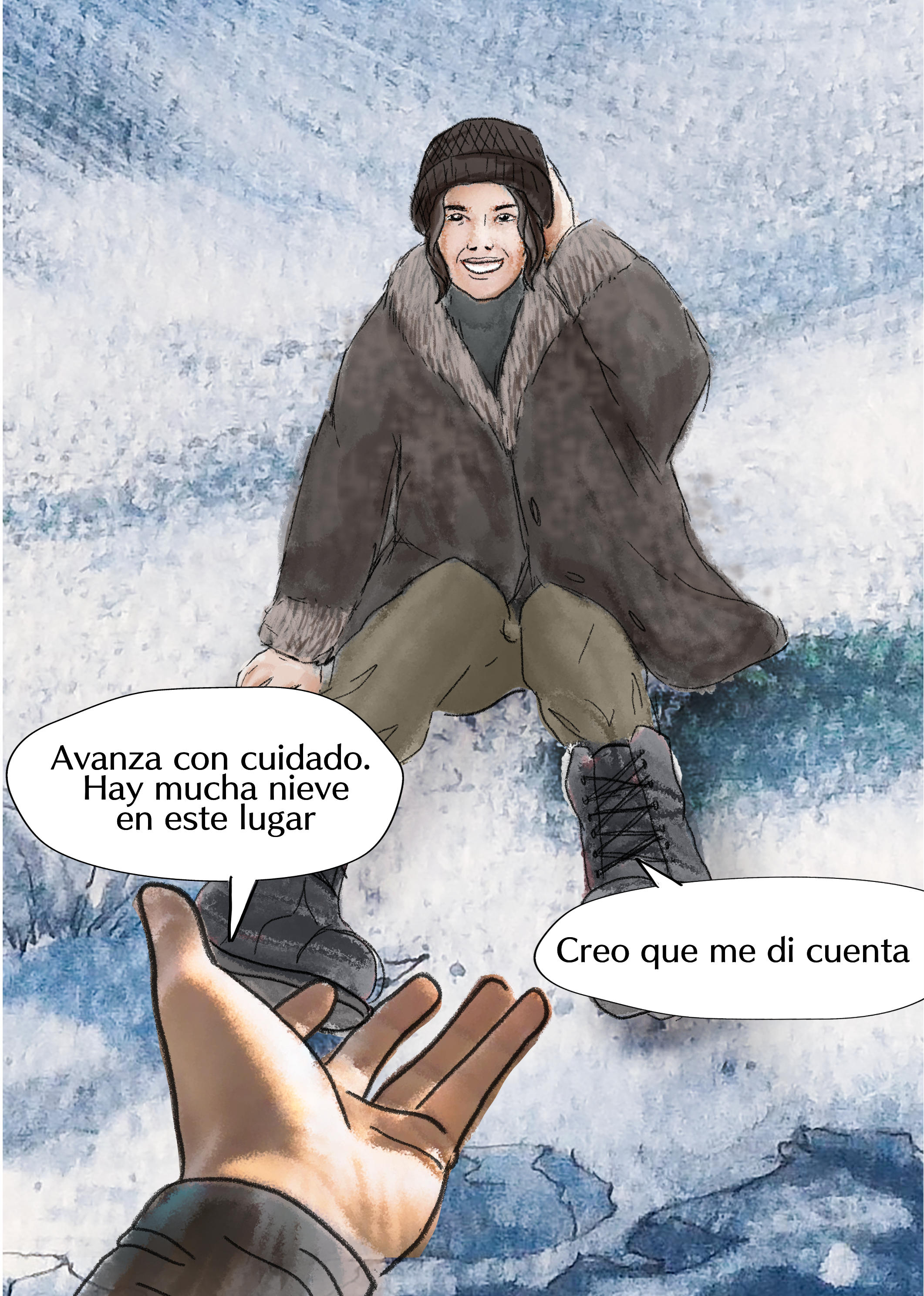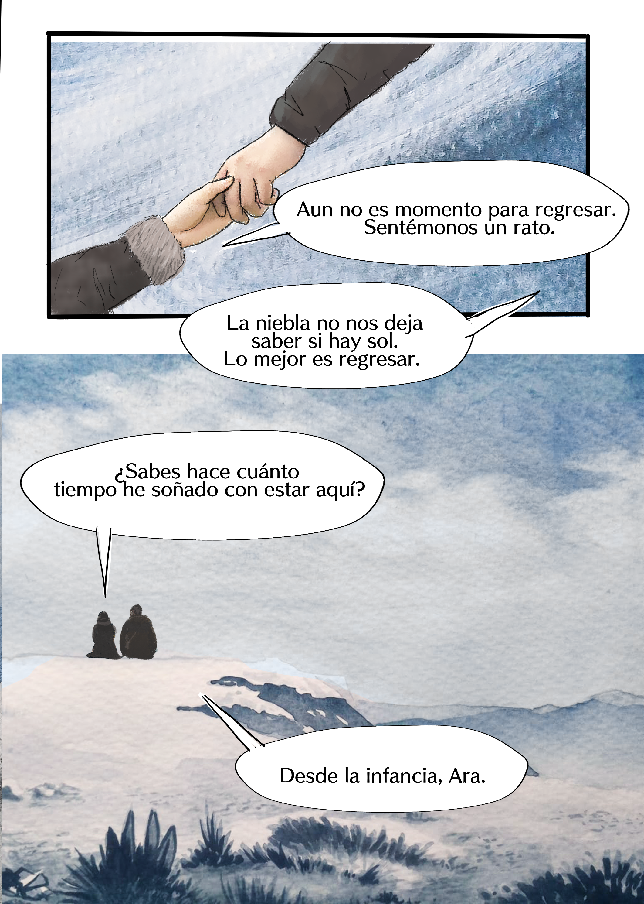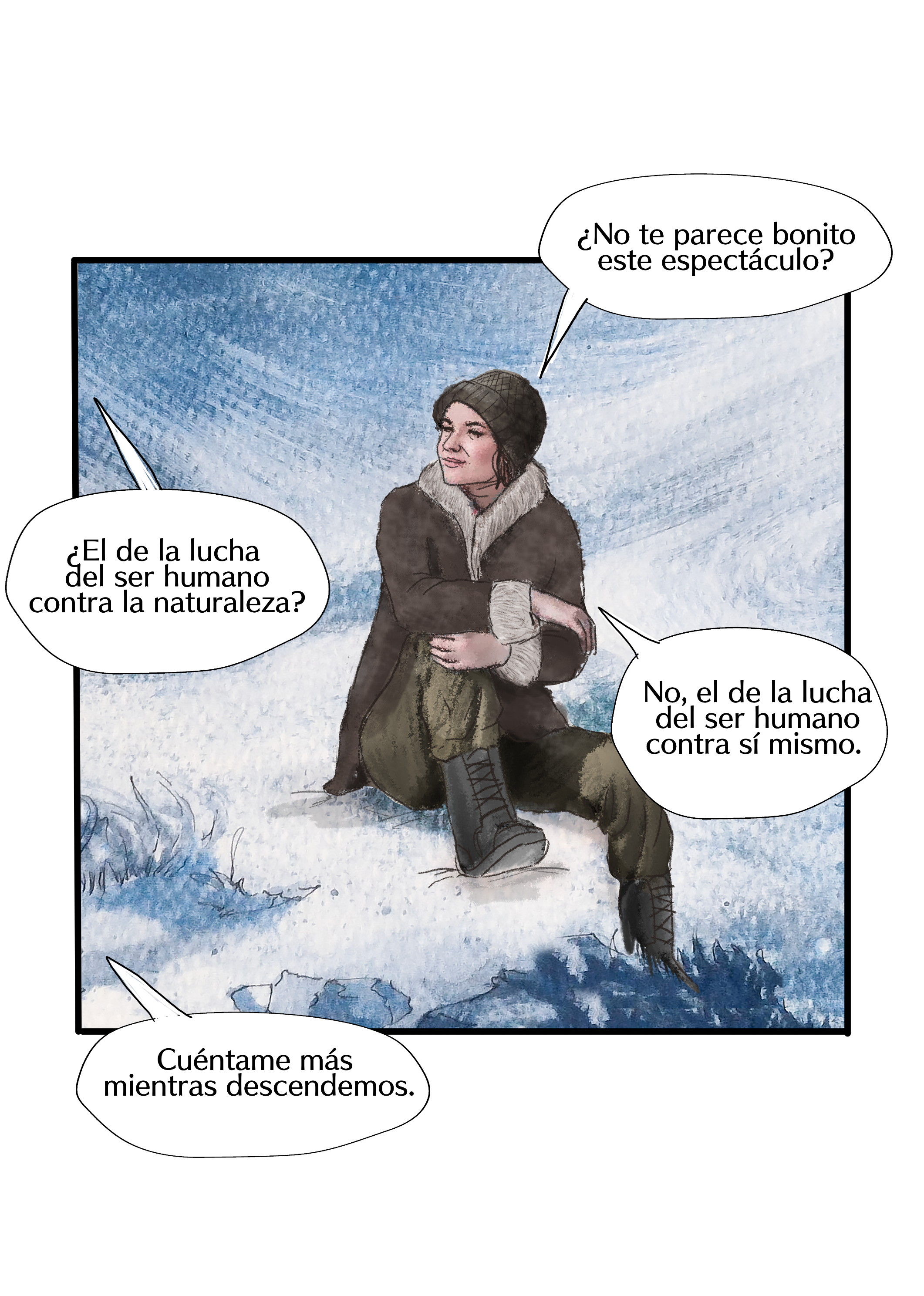 El alter ego de Fabiola Aguirre sube las laderas del Nevado del Ruíz recordando los momentos de su vida que la llevaron a ser lo que es. Entre viñetas surge una mirada a las características de su novela Dimensión de la angustia. El camino lo recorre acompañada de alguien que desde pequeña alimentó sus ilusiones y a quien no se esperaba.