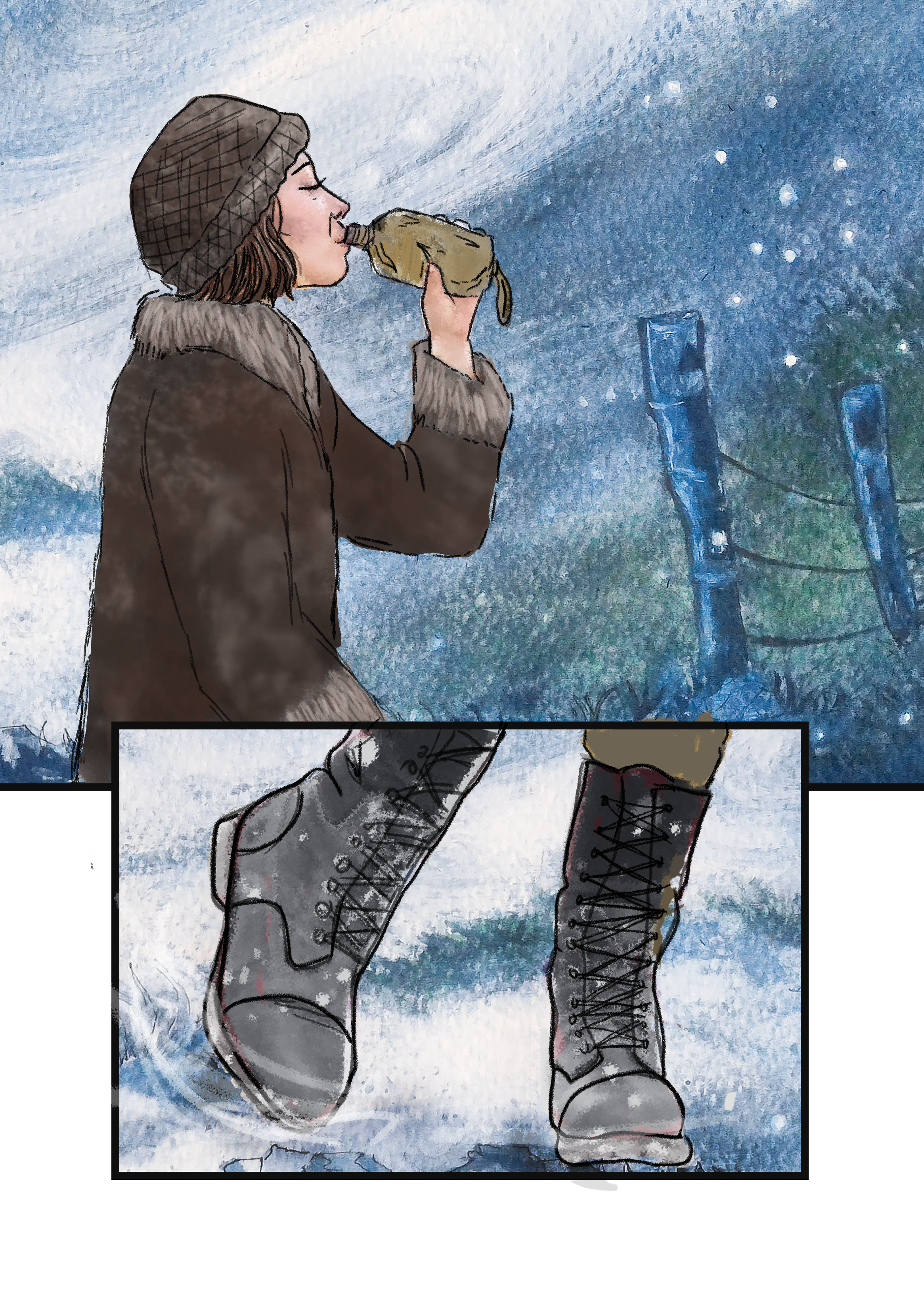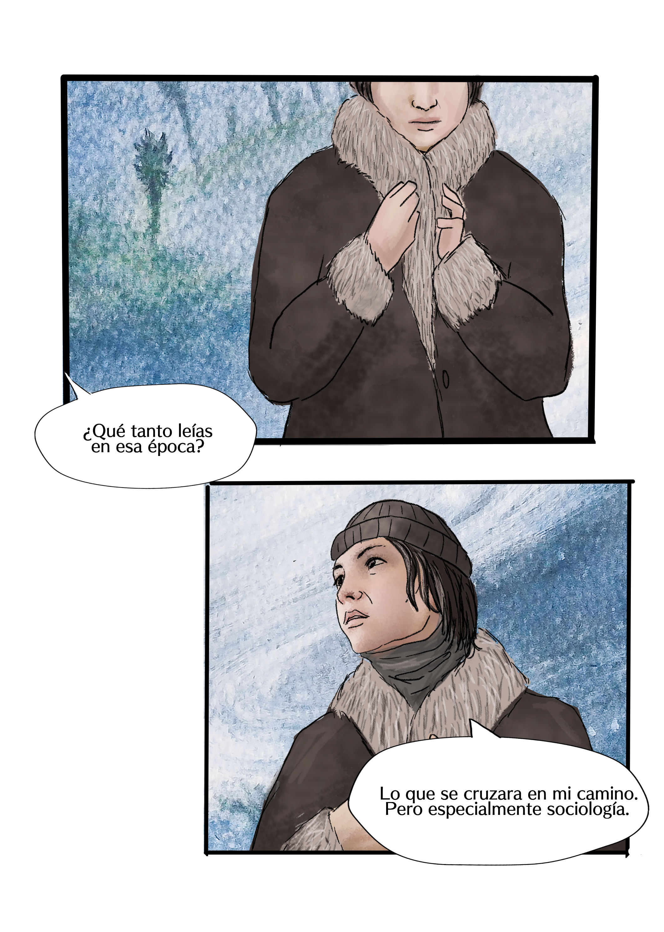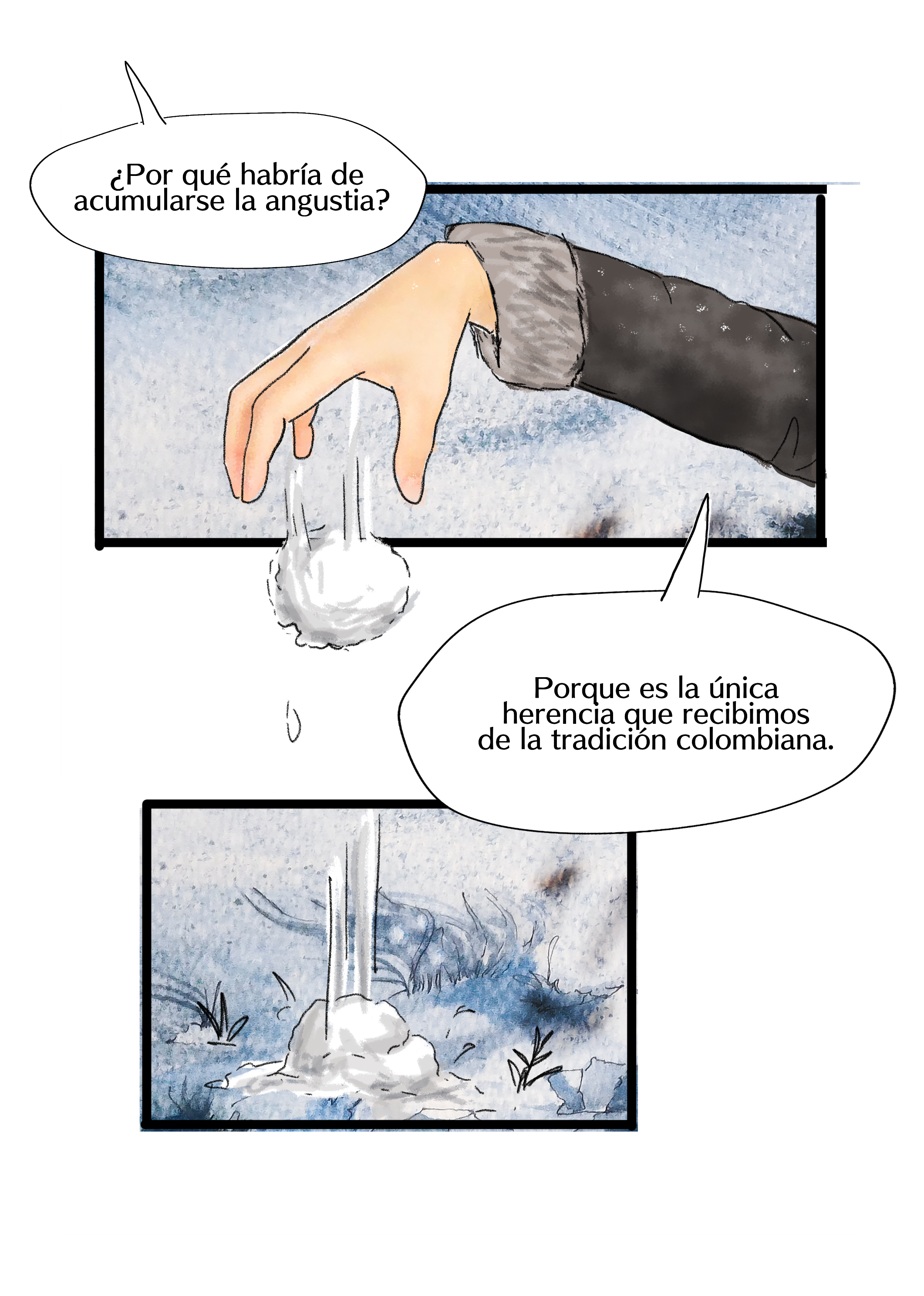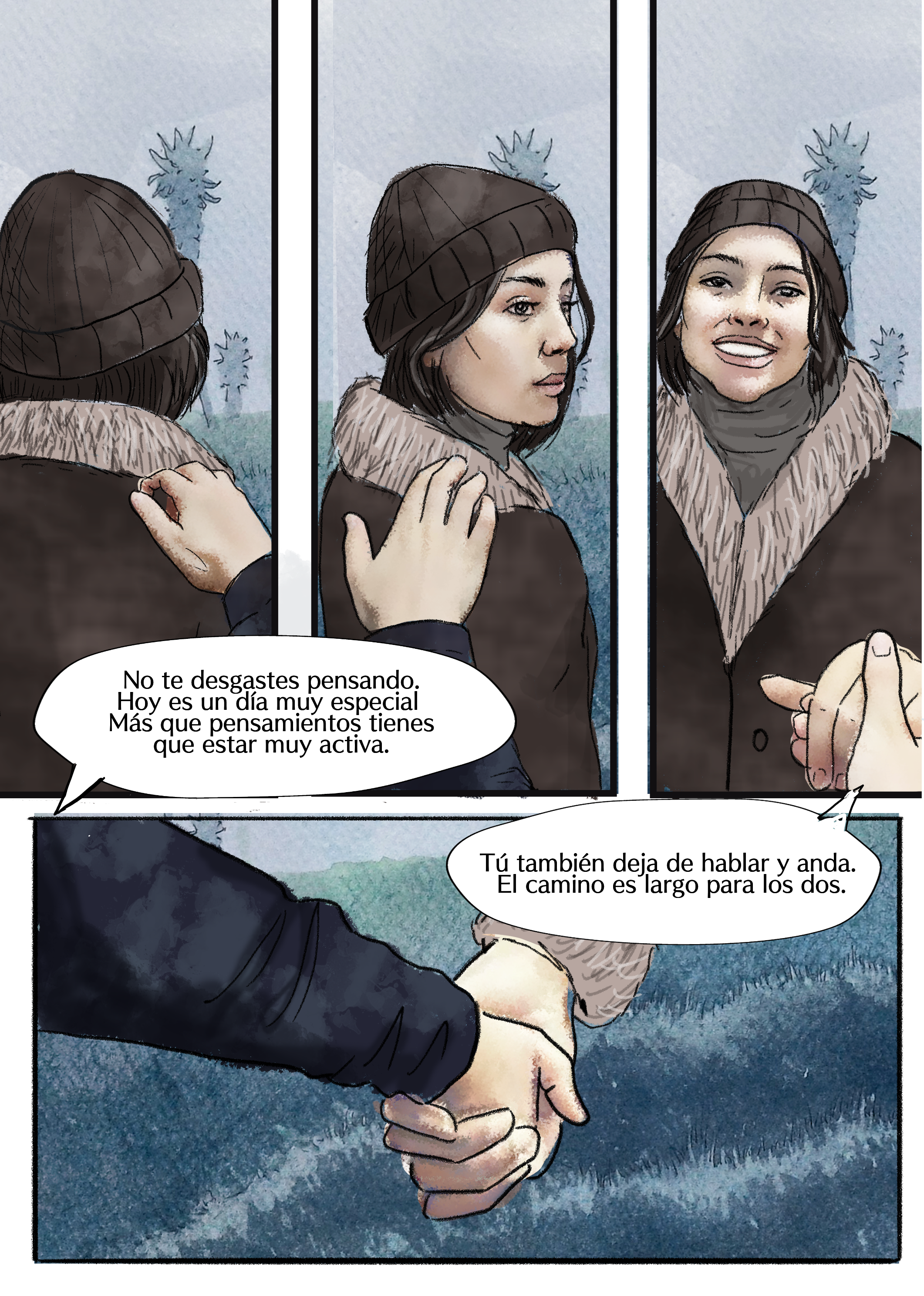 El alter ego de Fabiola Aguirre sube las laderas del Nevado del Ruíz recordando los momentos de su vida que la llevaron a ser lo que es. Entre viñetas surge una mirada a las características de su novela Dimensión de la angustia. El camino lo recorre acompañada de alguien que desde pequeña alimentó sus ilusiones y a quien no se esperaba.